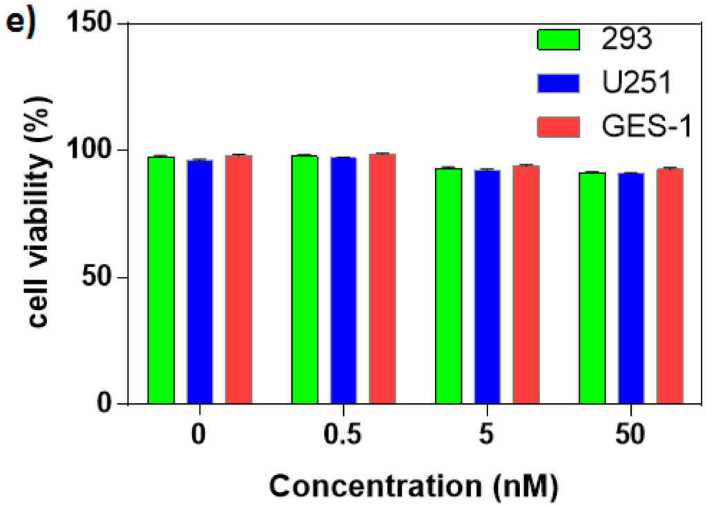 As shown in Figure 3d, the cytotoxicity of as-prepared dendrimer modified CdTe/CdS QDs was measured by MTT analysis. The cell viability of 293T cells treated with dendrimer modified CdTe/CdS QDs (50 nM) was about 95.2% and 93.2% after 24 h and 48 h incubation, while the cell viability was only about 36.7% after incubation 293T cells directly exposed with bulk CdTe QDs for 24 h, which proved that the dendrimer modified CdTe/CdS QDs had lower cytotoxicity than bulk QDs. Furthermore, none of cell lines including 293T, U251 and GES-1 cells shows a significant decrease in cell viability after exposing dendrimer modified CdTe/CdS QDs in the concentrations arrange from 0.5 to 50 mM for 24 h (Figure 3e). In a word, our prepared dendrimer modified CdTe/CdS QDs demonstrates an impressive biocompatibility with ultra-low toxicity, which is benefited to our following research.