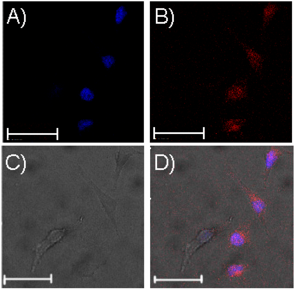 Fluorescence images of primary cultured U251 cells labelled with dendrime modified QDs. The U251 cells were stained by DAPI (Blue, A); Dendrimer modified CdTe/CdS QDs (Red, B); bright field (C) and merge images (D); Original magnification of (A–D) is 200×.