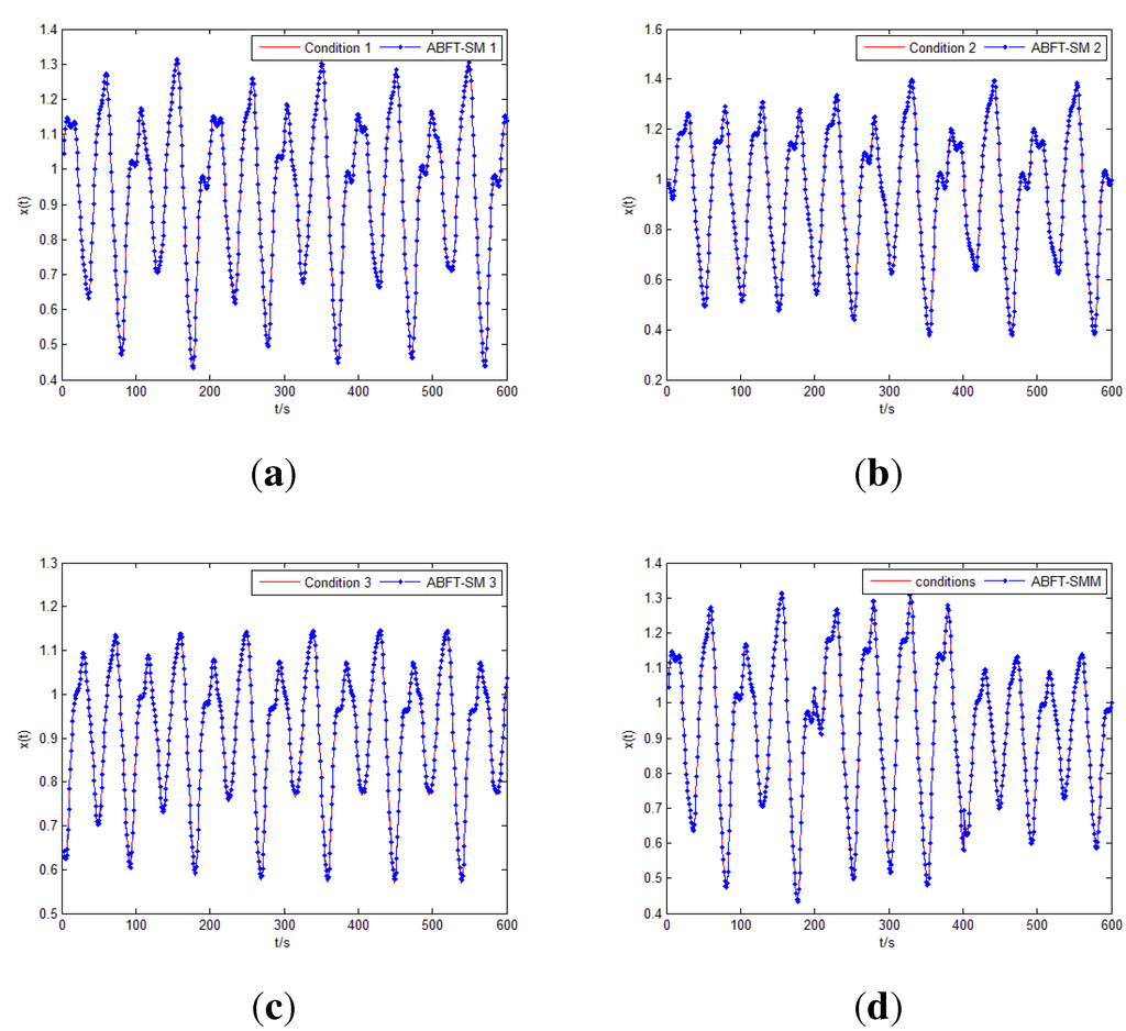Figure 1d shows the tracking result of the ABFT-SMM, where the 600 data samples are consisted with three different conditions. The first 200 data samples come from condition 1, the second 200 data samples from condition 2, and the third 200 data samples from condition 3. The centers for the agents are calculated in different conditions, so here the number of the centers for the fuzzy T-S multi-model is 19. The RMSE of the ABFT-SMM in this time is 0.0056, it is very close to the accuracy of the single condition, and the computation complexity is proper.