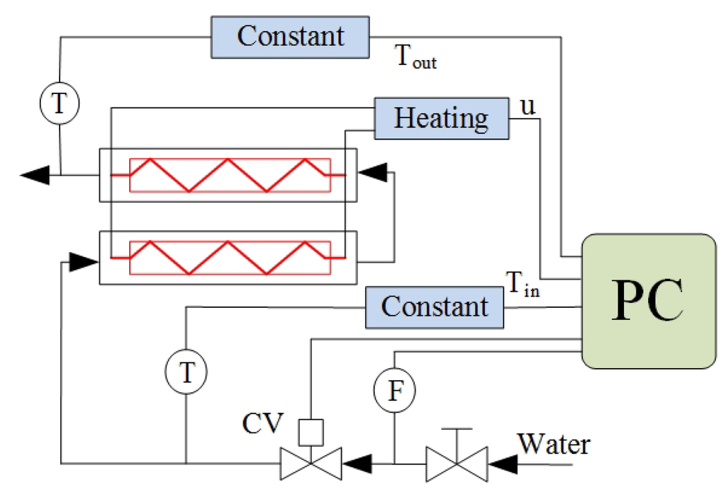 The schematic diagram of the water heater system is shown in Figure 2. The flow rate of cold water, F, which comes from the pipeline is controlled by the valve CV. Next, the cold water flows through a pair of metal pipes containing a cartridge heater. The outlet temperature, , of the water can be varied by adjusting the heating signal, u , of the cartridge heater [30]. To physical modeling, there are four parts in the circle: the cartridge-heater (subscript h), the streaming water (subscript w), the pipe wall (subscript p) and the environment (subscript e). The following three heat balances in the form of partial differential equations can be established: