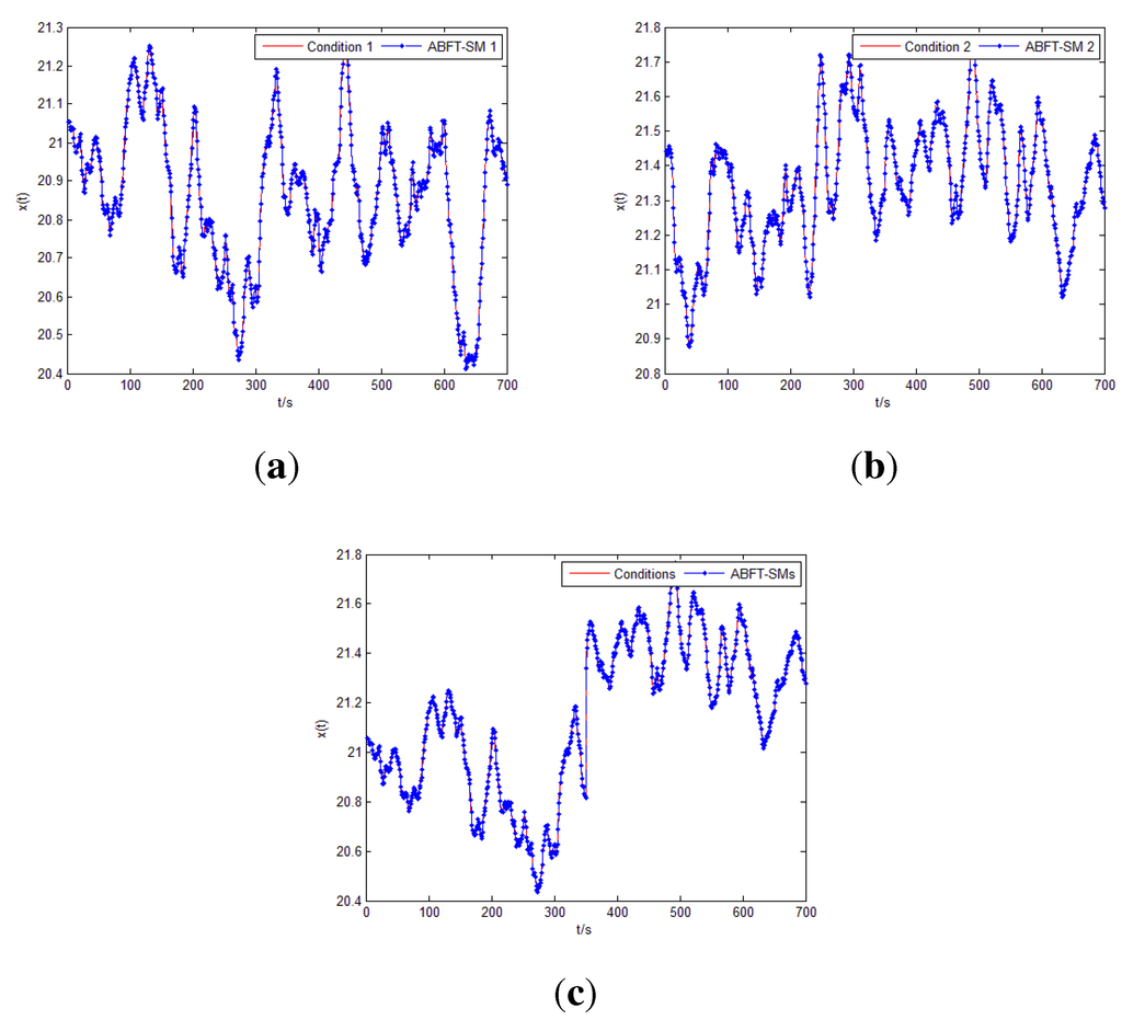 Figure 1a–c are corresponding to the working condition 1 to 3 respectively. The outputs of ABFT-SM 1 to ABFT-SM 3 matched the fixed condition curves smoothly, which means that the agents can run effectively in fixed working conditions. The main initial values and indexes of the prediction systems of different conditions are listed in Table 2, where is the cluster radius of the agents, both and are the initial values of the method, centers are the structure index and root mean square error (RMSE) is the performance index of the system.