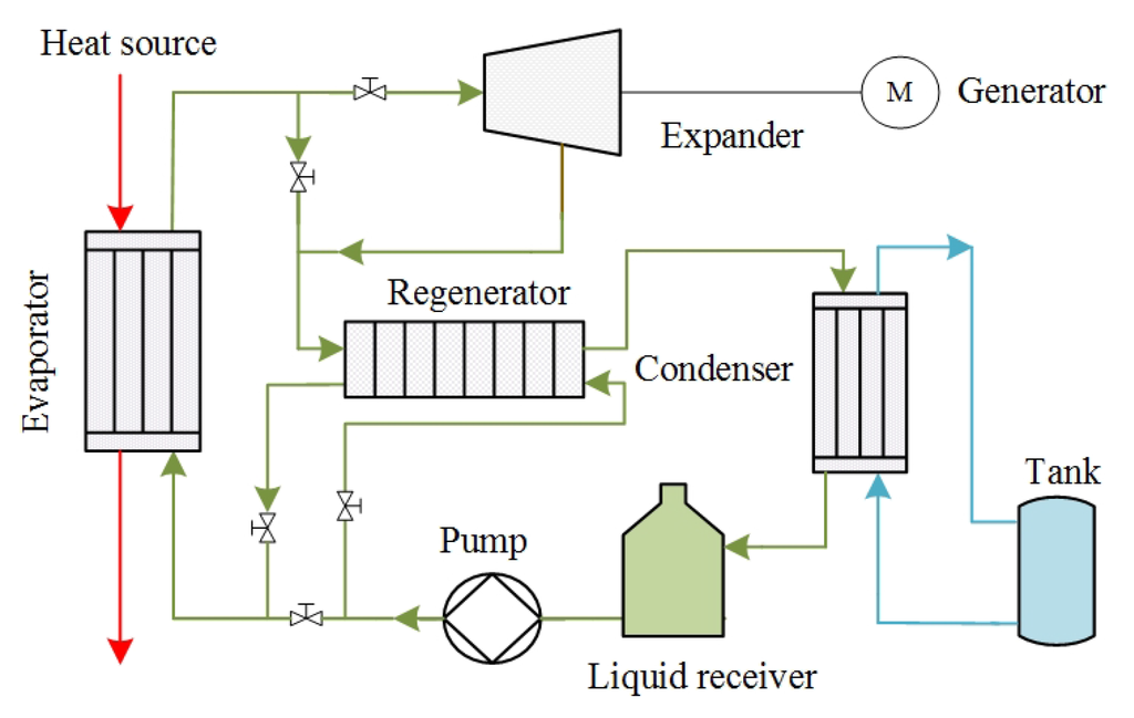 An application of modeling the 11 kW waste heat utilizing system is studied in this section, and the conceptual diagram of the power generate process is shown in Figure 4. In the system, R123 whose critical properties listed in Table 6 is selected as the working fluid. The energy of the waste heat source is transferred to the working fluid in the evaporator, and then the vaporized R123 enters the turbine and drives it to generate power. The working fluid vapor from the expander is next used to preheat the cold working fluid in a regenerator before it enters the evaporator. The vapor from the regenerator is then condensed back into liquid state in a water-cooled condenser. The liquid stored in a receiver then is pumped into the regenerator again.