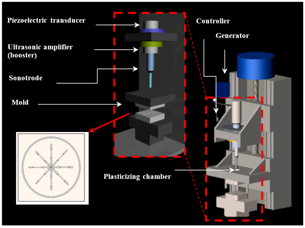 - Michaeli, W.; Kamps, T.; Hopmann, C. Manufacturing of polymer micro parts by ultrasonic plasticization and direct injection. Microsyst. Technol. 2011, 17, 243–249. [Google Scholar] [CrossRef]