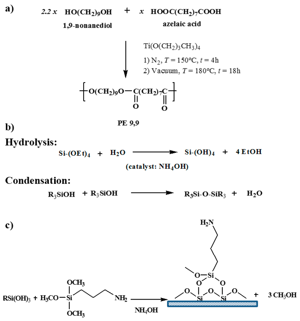 Poly(nonamethylene azelate) (PE99) was synthesized by thermal polycondensation of azelaic acid with an excess of 1,9-nonanediol (2.2:1 molar ratio), as shown in Figure 2a. Titanium tetrabutoxyde was used as a catalyst and the reaction was first performed in a nitrogen atmosphere at 150 °C for 6 h and then in a vacuum at 180 °C for 18 h. The polymer was purified by precipitation with ethanol of a chloroform solution (10 wt. %). The average molecular weight and polydispersity index determined by GPC and using poly(methyl methacrylate) standards were 13,200 g/mol and 3.1, respectively.