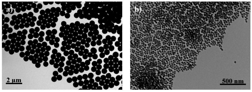 TEM micrographs of functionalized microspheres (a); and nanospheres (b).