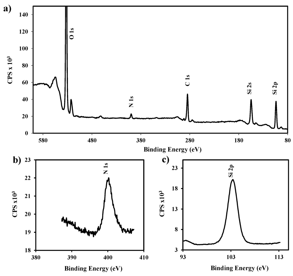 X-ray photoelectron spectroscopy (XPS) was performed with a SPECS system (Berlin, Germany) dotted with an XR50 source of Mg/Al (1253 eV/1487 eV) operating at 150 W. Analyses were performed in a SPECS system equipped with a high intensity twin-anode X-ray source XR50 of Mg/Al (1253 eV/1487 eV) operating at 150 W. A Phoibos 150 MCD-9 XP detector (Berlin, Germany) was employed. The overview spectra were taken with an X-ray spot size of 650 and pass energy of 25 eV in 0.1 eV steps at a pressure below 6 × 10−9 mbar. Surface composition was determined through the N 1s and Si 2p peaks at binding energies of 399.2 and 103.2 eV, respectively.