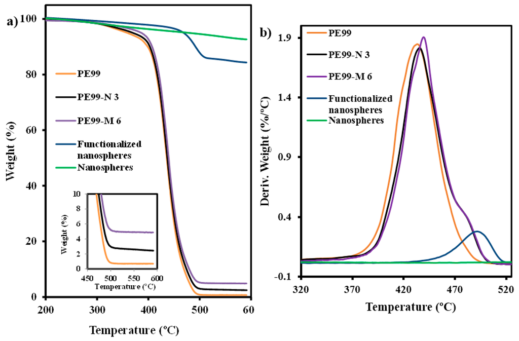 TGA (a) and DTGA (b) curves of silica nanospheres, functionalized silica nanospheres, and micro-molded PE99, PE99-N 3, and PE99-M 6 specimens.
