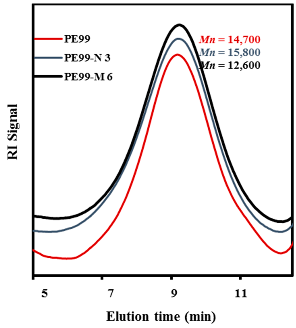 Molecular weights of raw PE99 and specimens processed under the above optimized conditions are summarized in Table 1, whereas Figure 6 compares the GPC traces of PE99, PE99-N 3, and PE99-M 6 specimens.