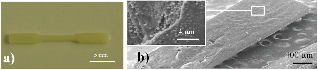 Image of a processed PE99 specimen (a); SEM micrograph of details of a micro-molded PE99-M 3 specimen (b). Microparticles can be observed in the inset.