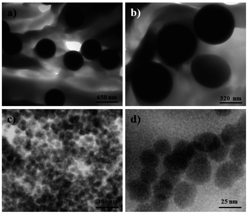 TEM micrographs of the dispersion of functionalized silica microspheres (a,b) and nanospheres (c,d) in the micro-molded PE99-M 3 and PE99-N 3 specimens.