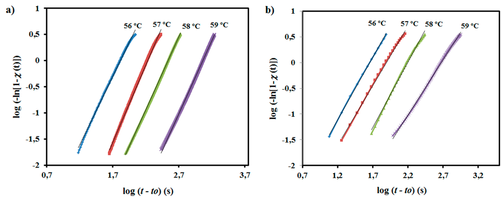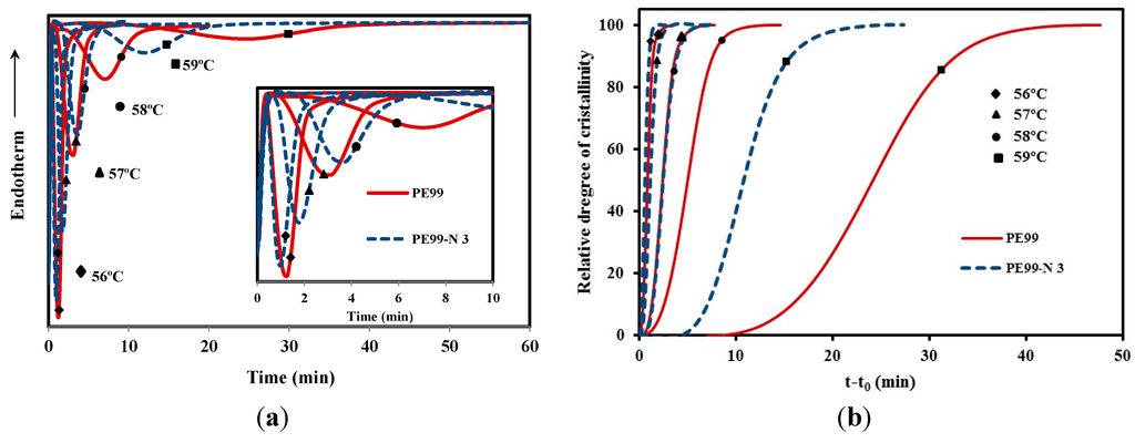 Crystallization experiments were therefore carried out in a narrow temperature interval (i.e., between 56 and 59 °C) due to experimental limitations. Figure 10a shows the crystallization exotherms of the neat polyester and the PE99-N 3 nanocomposite, which allowed for determining the time evolution of the relative degree of crystallinity, χ(t). The last was calculated according to Equation (1):