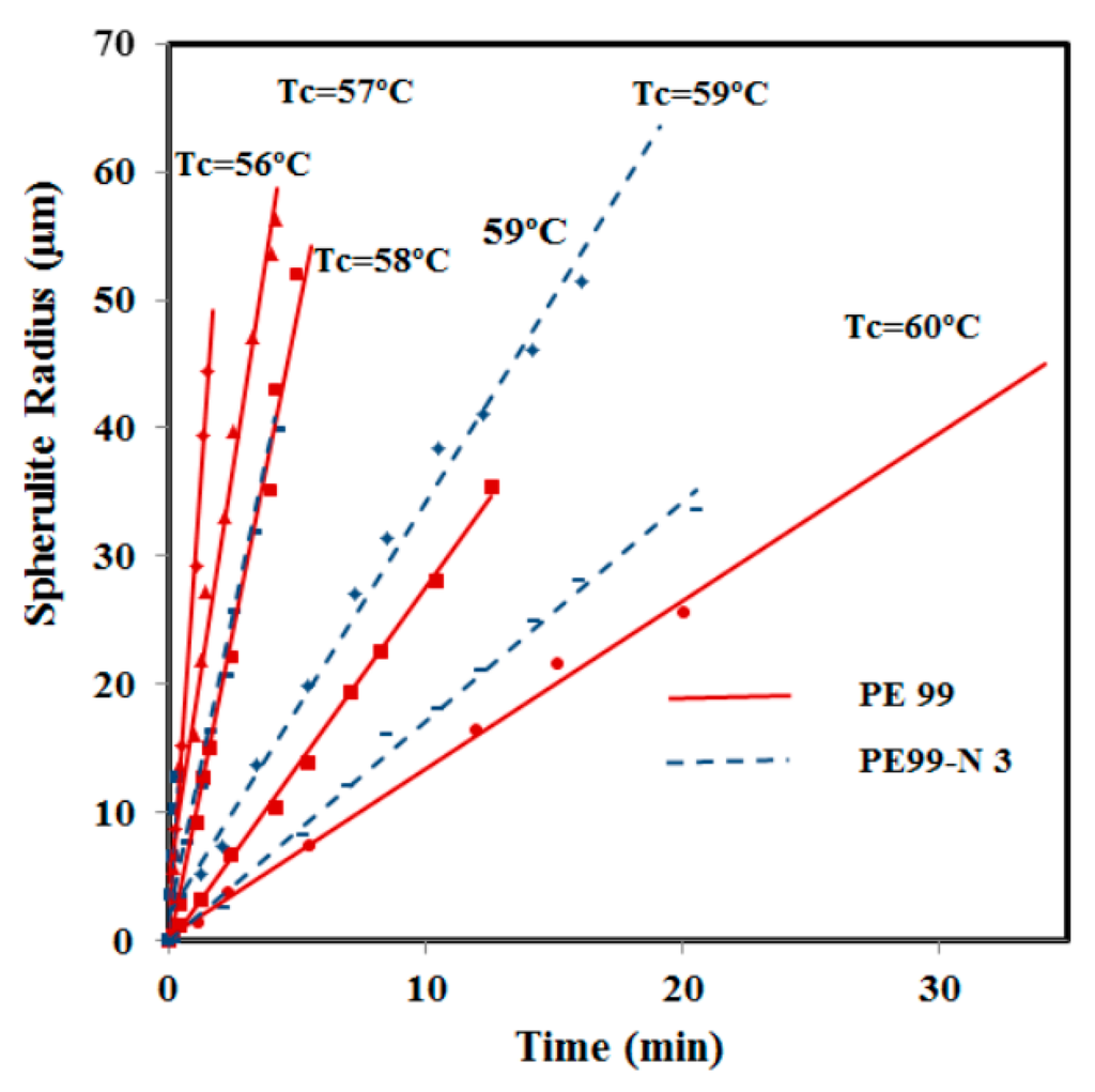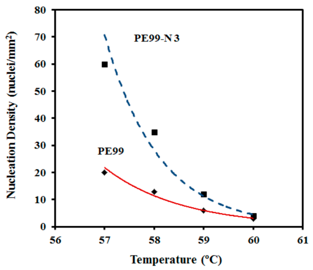 Despite the morphological similarities, great differences were detected in the primary nucleation (Figure 14). They were more remarkable at low crystallization temperatures; for example, nucleation densities of 60 and 20 nucleus/mm2 were determined from the optical micrographs taken at 57 °C. Note that crystal growth rates were similar at this temperature; consequently, the differences determined for the overall crystallization rate (e.g., 0.01284 and 0.00589 s−1 for PE99 and PE99-N 3 at 57 °C, respectively) were mainly attributed to a nucleation effect. On the contrary, nucleation densities were similar at high temperatures, while crystal growth rates were clearly different. Therefore, the incorporation of nanoparticles had a strong impact on the overall crystallization rate due to differences in crystal growth rate and primary nucleation densities, which became more significant at high and low crystallization temperatures, respectively. Figure 14 also shows that the nucleation density increased exponentially for the two samples at lower crystallization temperatures. These changes in nucleation logically affected the final spherulite size. Thus, a diameter decrease from 120 μm to 35 μm and from 80 μm to 15 μm was observed for PE99 and PE99-N 3 samples, respectively, when the temperature decreased from 60 °C to 56 °C.