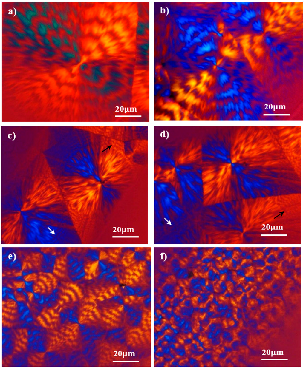 Optical micrographs of PE99 (a,c,e) and PE99-N 3 (b,d,f) spherulites isothermally grown at 60 °C (a,b); first step at 59 °C and second step at 54 °C (c,d); and 56 °C (e,f). Well-defined rings with interspacing between 3 and 2 μm were detected (see arrows) in the outer part of spherulites grown at 54 °C.
