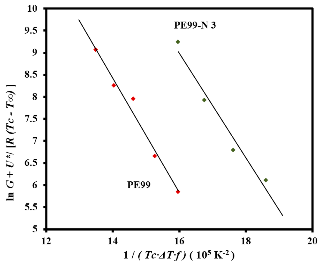 The Lauritzen-Hoffman plot was fitted with straight lines (r2 > 0.97) for micro-molded PE99 and PE99-N 3 samples when the “universal” values reported by Suzuki and Kovacs [32] (i.e., U* = 1500 cal/mol and T∞ = Tg − 30 K) and the experimental Tg of PE99 (i.e., −45 °C) were used in the calculation (Figure 15).