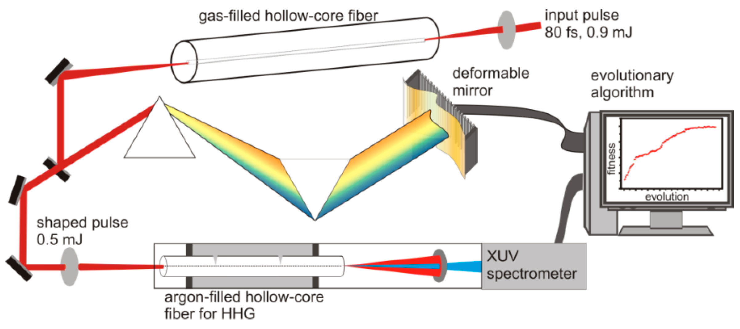 After spectral broadening in a gas-filled hollow-core fiber (HCF) laser pulses are sent through a prism-compressor with a computer-controlled deformable mirror for pulse shaping. Afterwards, the pulses are focused into an argon-filled capillary where they generate high harmonics. These are detected by an extreme ultraviolet (XUV) spectrometer and its signal is used as a feedback for an evolutionary algorithm.