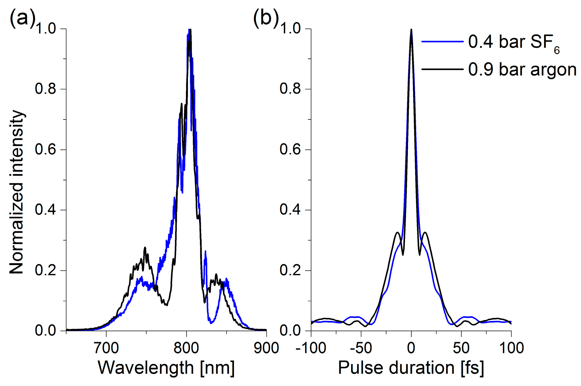 For a better comparison of the applicability for pulse-shaping two broadened spectra (spectral range between 700 nm and 880 nm) and their corresponding Fourier transform assuming a flat spectral phase are shown in Figure 4. For SF6 two observations should be pointed out: (i) the total spectral width is a few nanometers larger due to the enhanced redshifted part of the spectrum and (ii) the width of the central peak of the spectrum is larger due to the missing dip around 775 nm as for argon. Looking at the Fourier transform of both spectra there is not much difference in terms of pulse duration and shape. However, the presented pulse shaping scheme may benefit from the spectral characteristics of the SF6-broadened spectrum due to the more favorable shape: (i) as a minor contribution the increase in total bandwidth directly translates into a better illumination of the deformable mirror surface and (ii) as a major contribution the spectral amplitude distribution is pronounced between 760 nm and 825 nm.