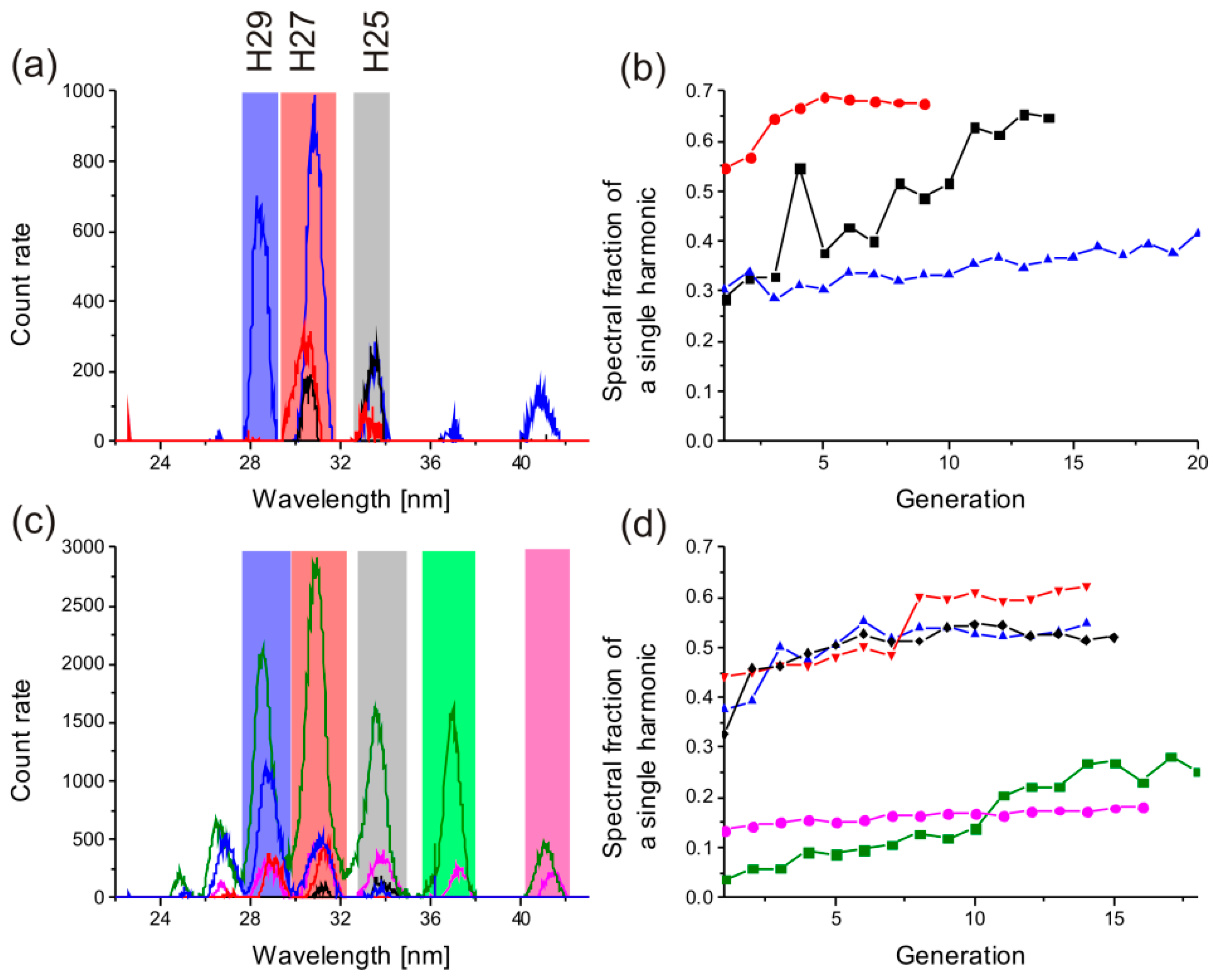 Using argon for spectral broadening the results for selective optimization of three different spectral regions are shown in Figure 7a, and in Figure 7b we depict the evolution of the fitness. The most remarkable observations are: (i) for selection of the 29th harmonic (blue marked range) the fitness only slightly increases and the low energy harmonics still substantially contribute to the observed spectrum; (ii) for the 27th harmonic (red marked range) the spectral fraction can be increased up to 65% of the spectrum. However, the spectral selection is achieved at the cost of a reduced total count rate; (iii) Optimization for the 25th harmonic (black) shows an increase of the spectral fraction of the harmonic by a factor of 2. The absolute yield of the 25th harmonic is very similar to that of the optimization for the 29th harmonic but lower and higher orders of harmonics are suppressed.