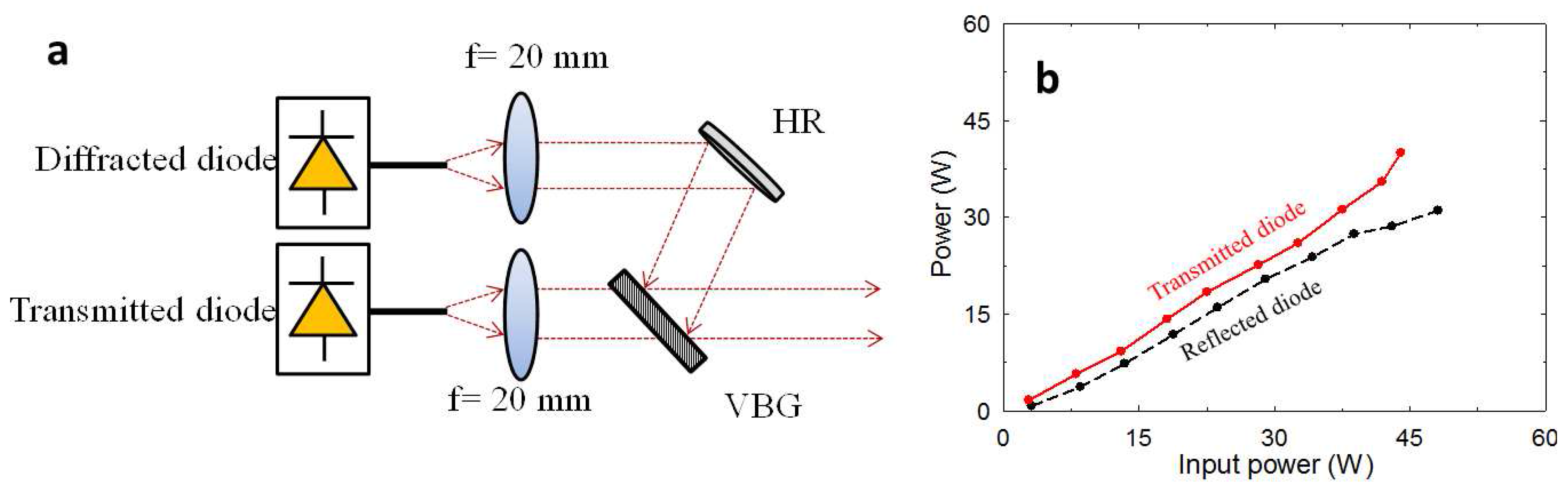 (a) Experimental setup of the spectrally beam-combined diode pump source; (b) Reflected and transmitted pump power after VBG vs. input power of each diode.
