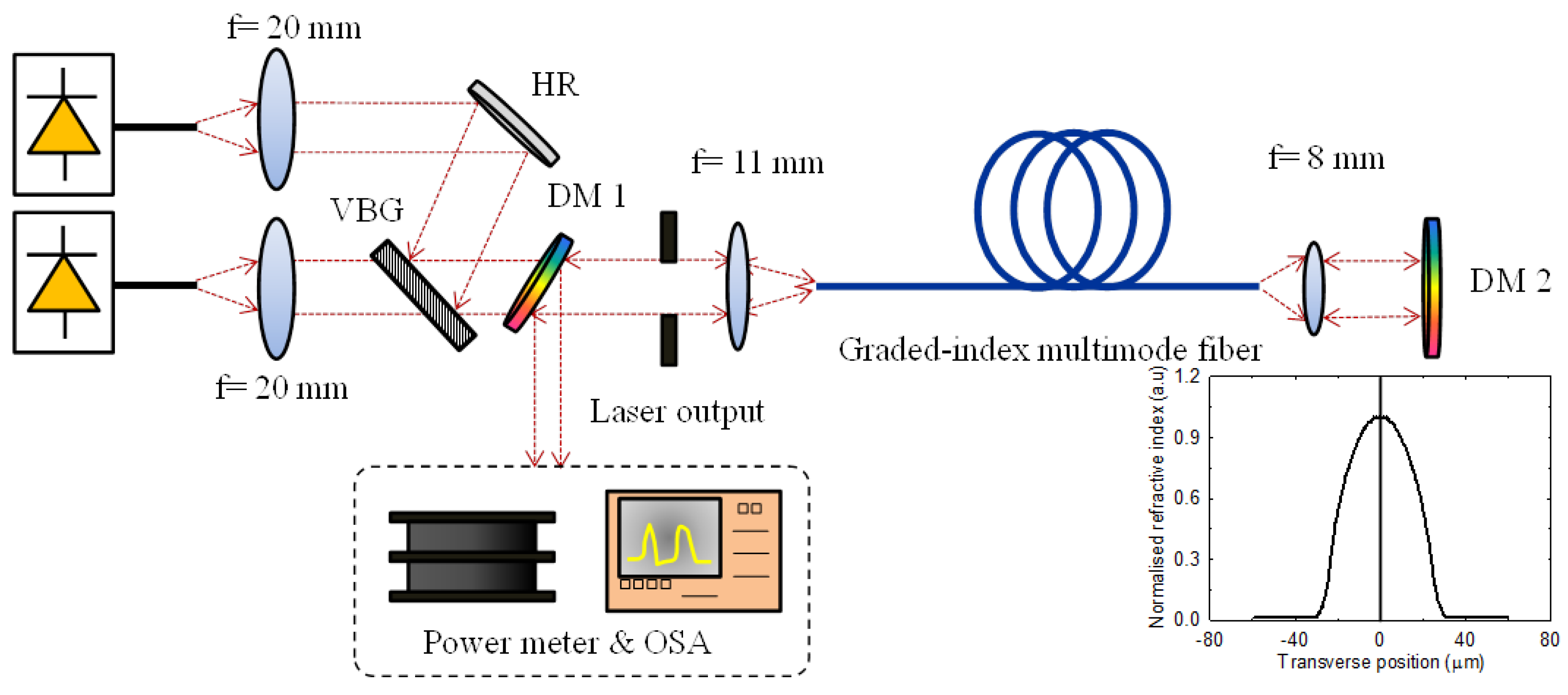 Experimental setup of the CW FRL with GRIN Raman gain fiber. VBG: volume Bragg grating; DM: dichroic mirror; HR: high reflection mirror. Inset: refractive index profile (RIP) through the center of the core of the GRIN MM fiber.