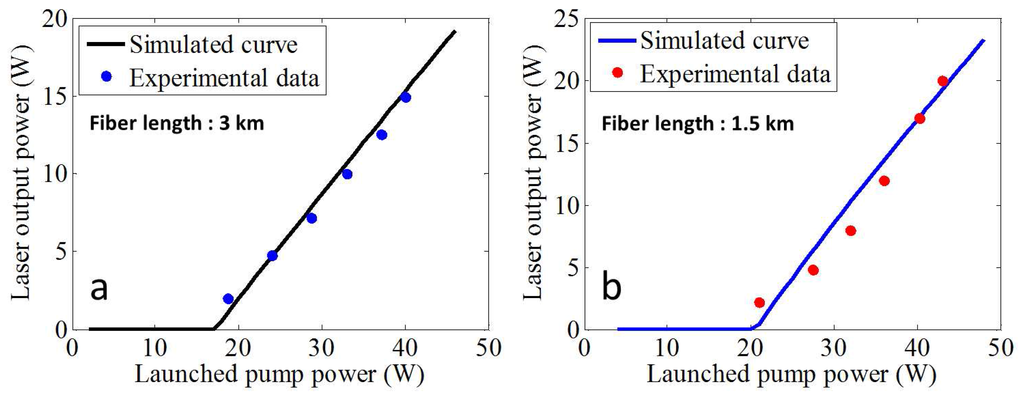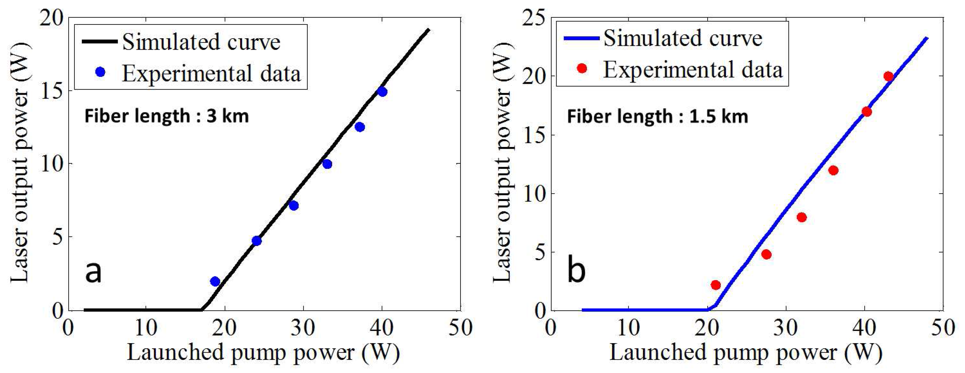 Simulated and experimental CW FRL output power against the launched pump for GRIN-MM fiber lengths of 3 km (a) and 1.5 km (b).