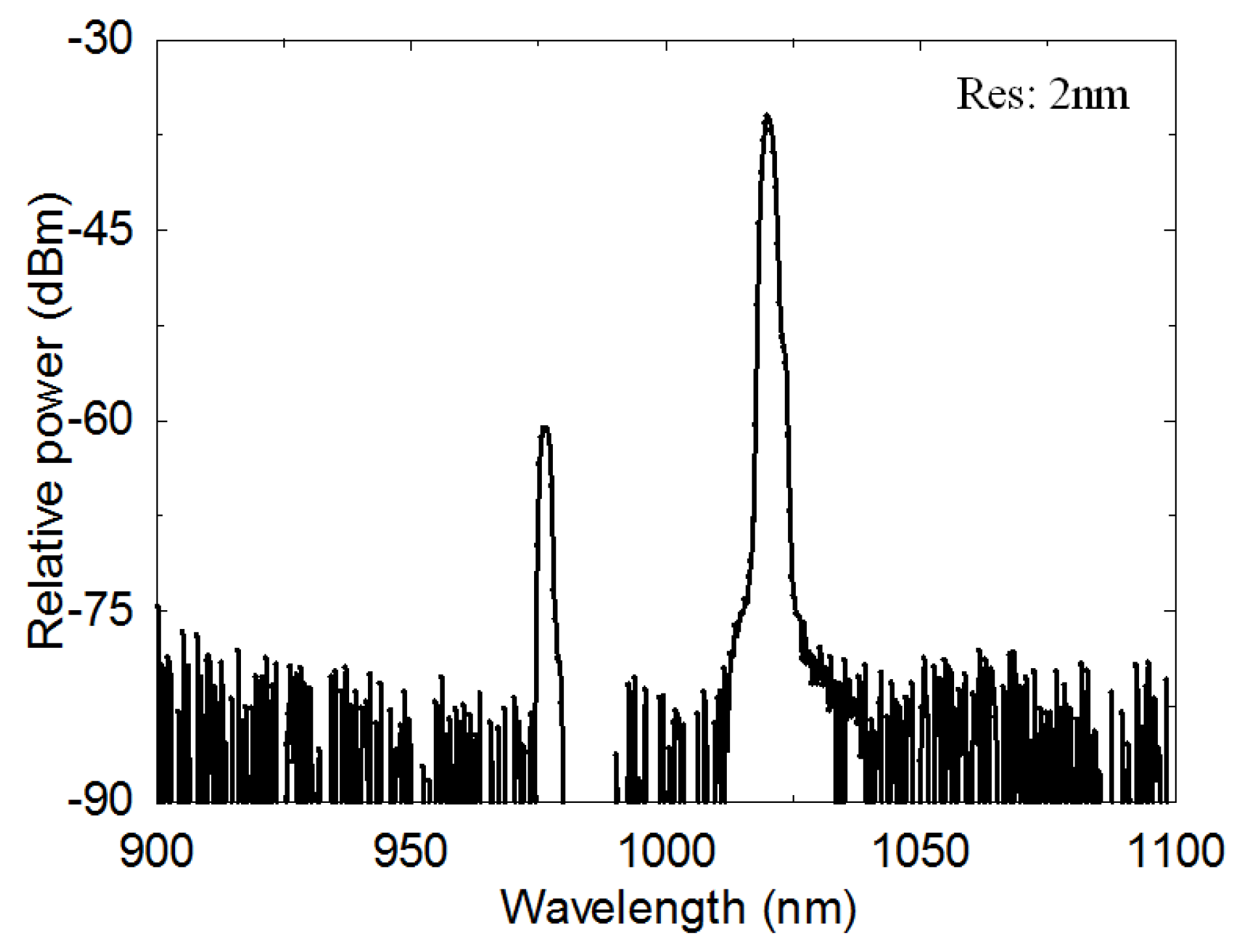 Finally, Figure 4 shows the output spectrum from the 1.5 km fiber at full power. There is no sign of the second Stokes. The emission wavelength was 1019 nm for a Stokes shift of approximately 443 cm and a quantum defect of only 4.3%. The measured linewidth was resolution-limited (2 nm).