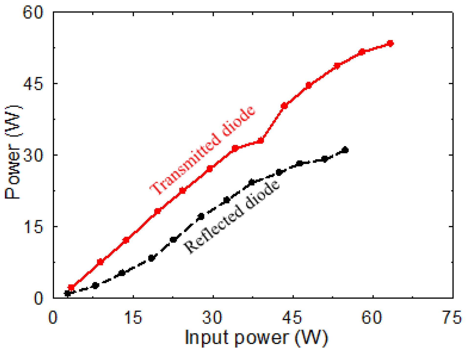 Reflected and transmitted pump power after VBG with 60-W diodes vs. power incident on the VBG.