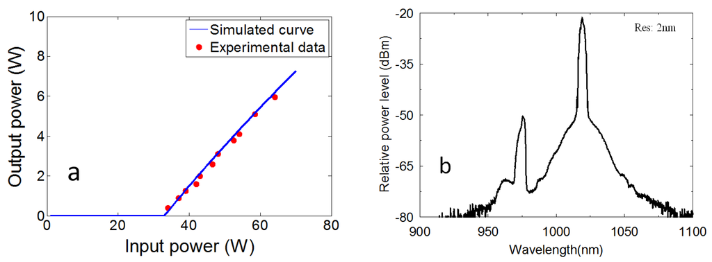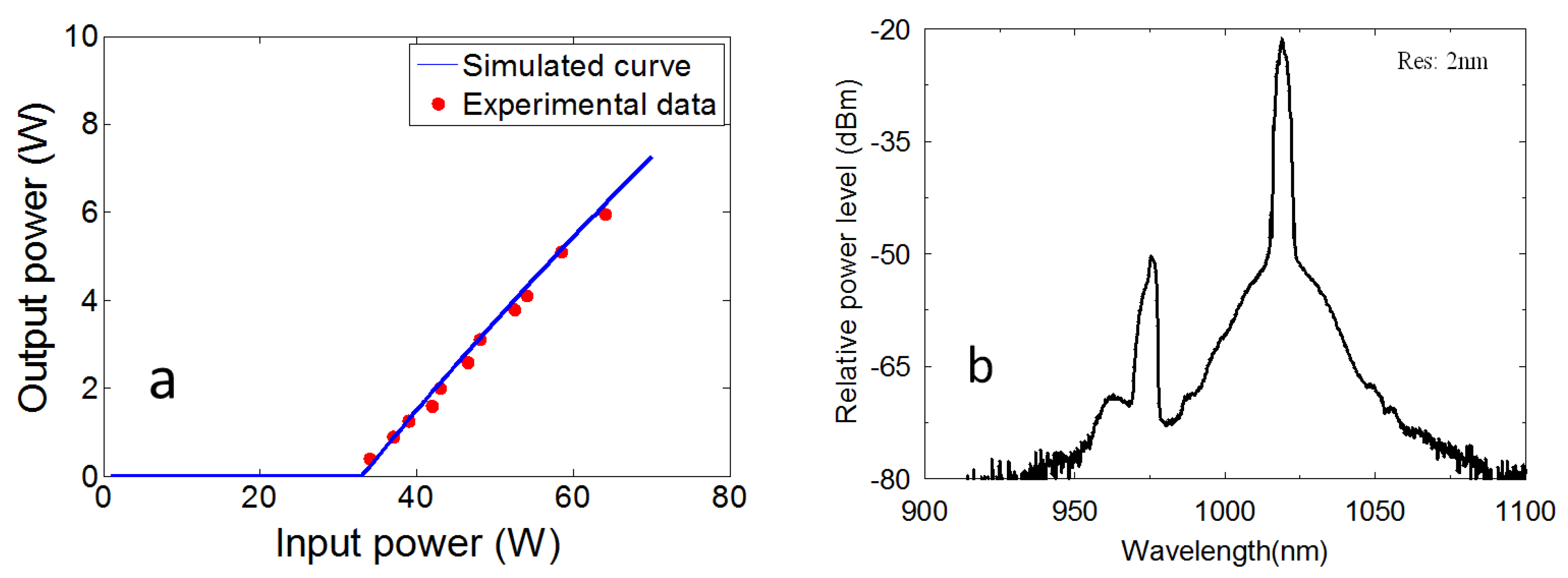 (a) Experimental FRL output power with DCRF vs. pump power; (b) Experimental FRL output spectrum at 6 W maximum powers with DCRF.