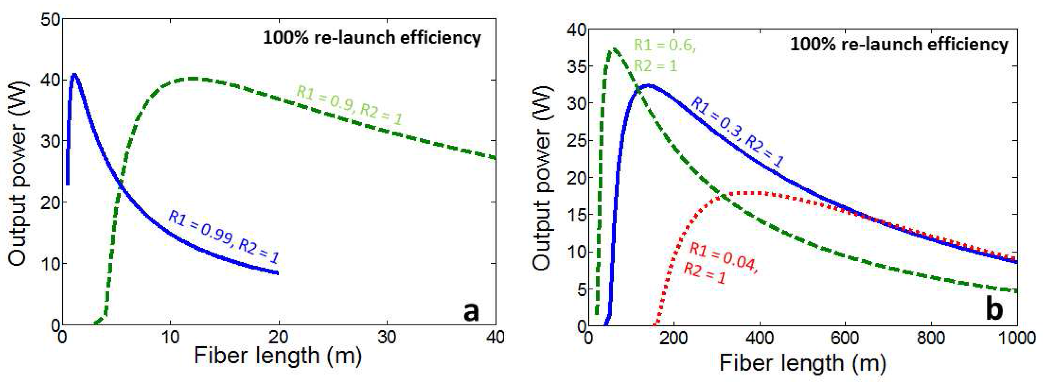 In reality, the re-launch losses may well be significant (as they were in our experiments). Figure 9 shows several curves indicating the output powers which are possible with different re-launch and out-coupling ratios with 65 W of launched pump power. Figure 9 also contains data calculated with the re-launch efficiencies of 64% at the high reflectivity end and 58% at the out-coupling end as suggested by our curve-fitting to the experimental data of the DCRF. The output power becomes 6 W for the 650 m of fiber we used. This improves to ∼12 W, at the optimum fiber length of ∼200 m. Reduced re-launch losses allow for much larger improvements, as exemplified with several curves in Figure 8 and Figure 9.