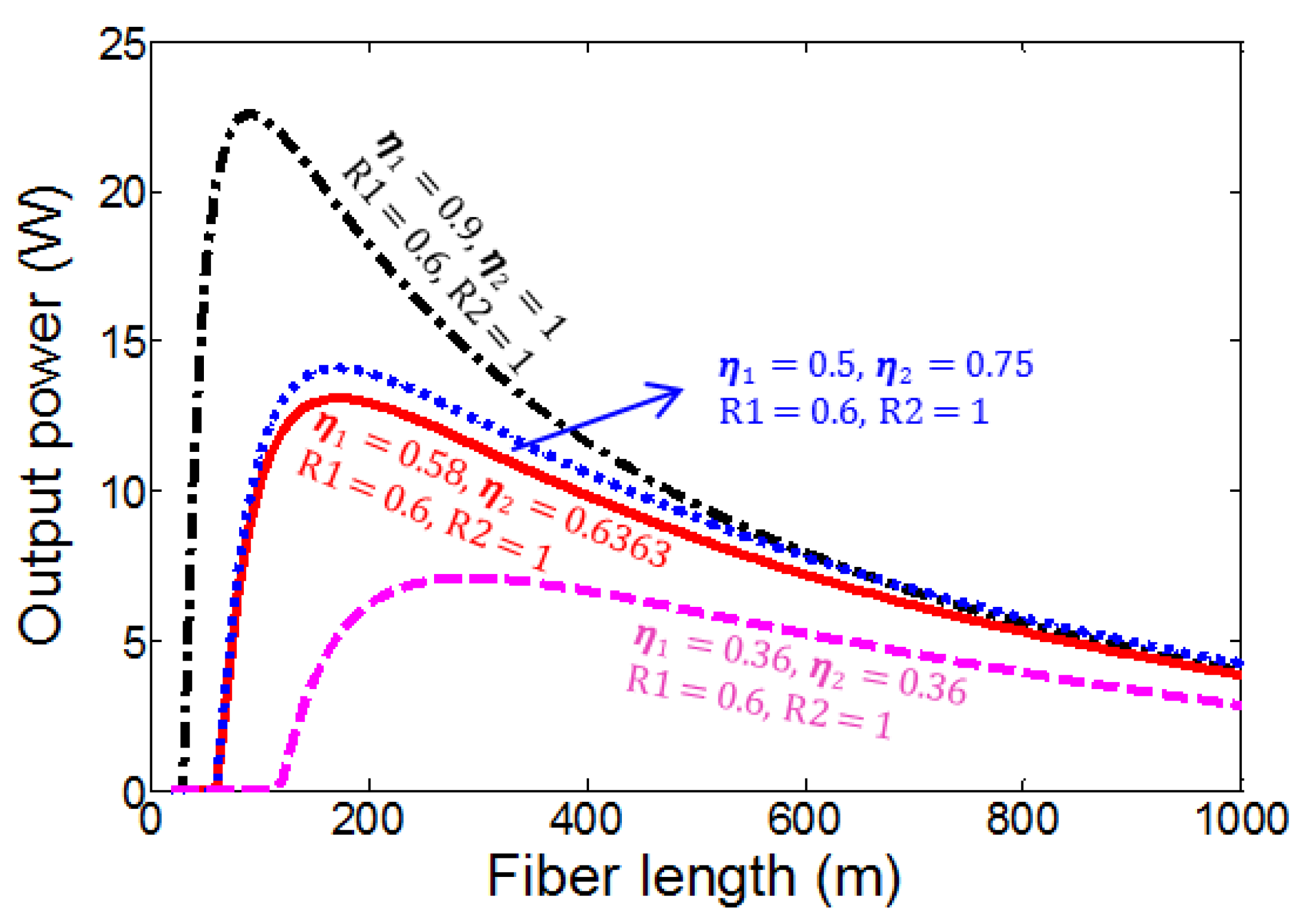 Simulation of output power vs. DCRF length at pump power of 65 W (launched) for different reflectivities of the output coupler (R1) and re-launch efficiencies ( corresponds to out-coupling end and corresponds to high reflectivity end ).