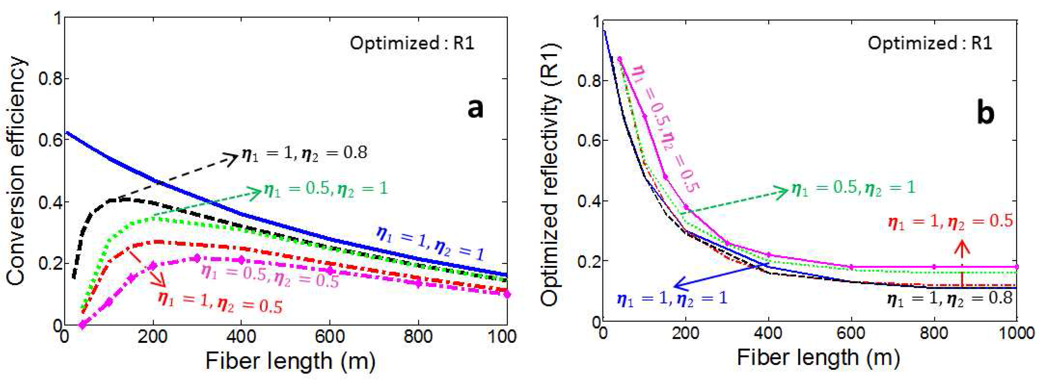 (a) Simulations of conversion efficiency vs. DCRF length with optimized output couplings for different re-launch efficiencies ( and ); (b) optimum reflectivity of the out-coupling end R1 for different re-launch efficiency corresponding to Figure 10a. In the HR end, = 1 in all cases.
