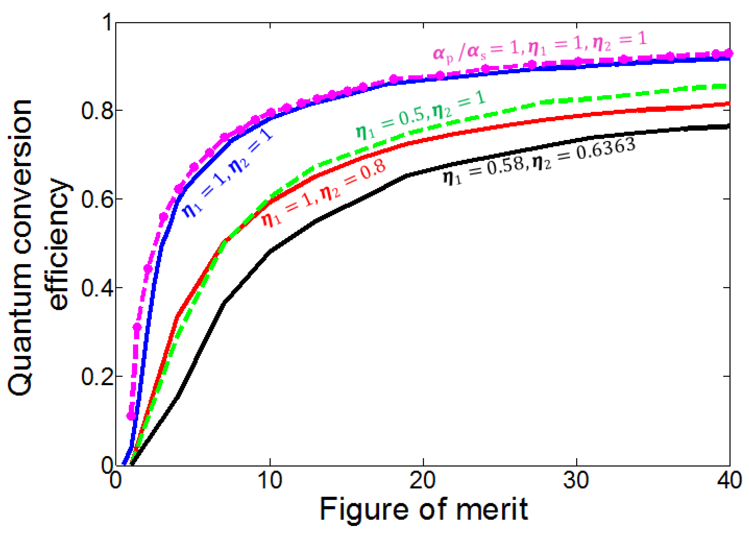Simulated curves of quantum conversion efficiency vs. figure of merit () for optimized out-coupling and fiber length for different re-launch efficiencies at out-coupling end () and HR re-launch end (). Loss ratio = 1.09, except for the uppermost curve, which has a loss ratio of 1.