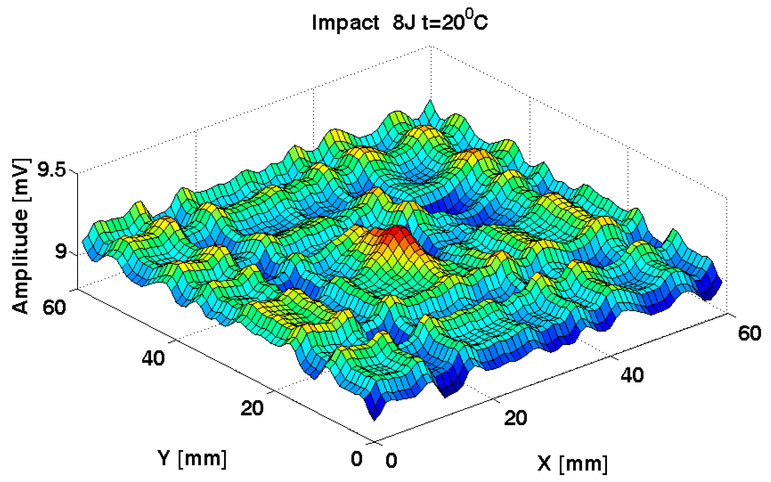 Carbon fiber woven embedded into PPS offers strength of composite to impact. The FRPC has the transverse electric conductivity between 10 S/m and 100 S/m and longitudinal conductivity ranging between 5 × 103 S/m and 5 × 104 S/m and is paramagnetic, allowing eNDE. The samples were impacted with an energy of 8 J [59], in order to induce delaminations. The impacts are induced with FRACTOVIS PLUS 9350 CEAST (Instron, Nordwood, MA, USA), which allows the modification of impact energies as well as the temperature during impact. The conditions of the impact are designed according to ASTM D7136 [82] at a temperature of 20 °C. Under impact, the FRPCs suffer delamination, usually accompanied by a dent, deviation, and/or breaking of the carbon fibers. In all cases, a reduction in the space between fibers in the thickness direction appears and this causes an increase in fiber contact, leading to a decrease of electrical resistance in the thickness direction and modifying the local electrical conductivity both in the plane of the fibers and perpendicularly on fibers [83]. The energy absorbed by the composite serves as the plastic deformation of the composite in the contact zone, being dissipated through internal friction between the matrix’s molecules, carbon fibers, and matrix-carbon fibers, as well as at the creation of delaminations. Typical records of force vs. time during impact can give information about the FRPC status (delaminated or not) [84].