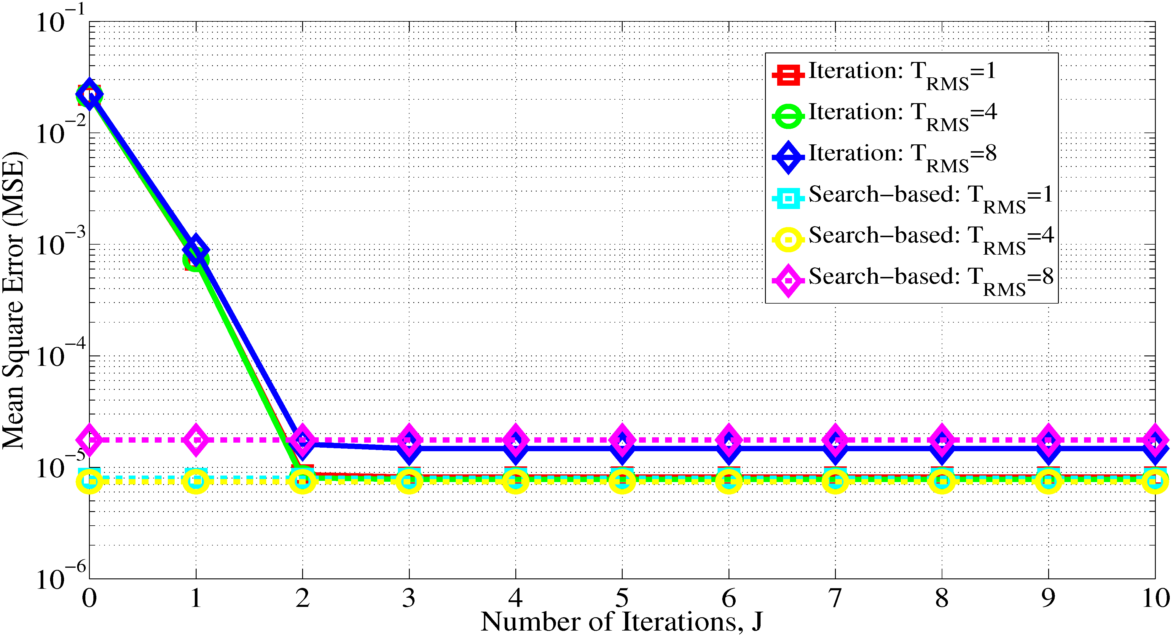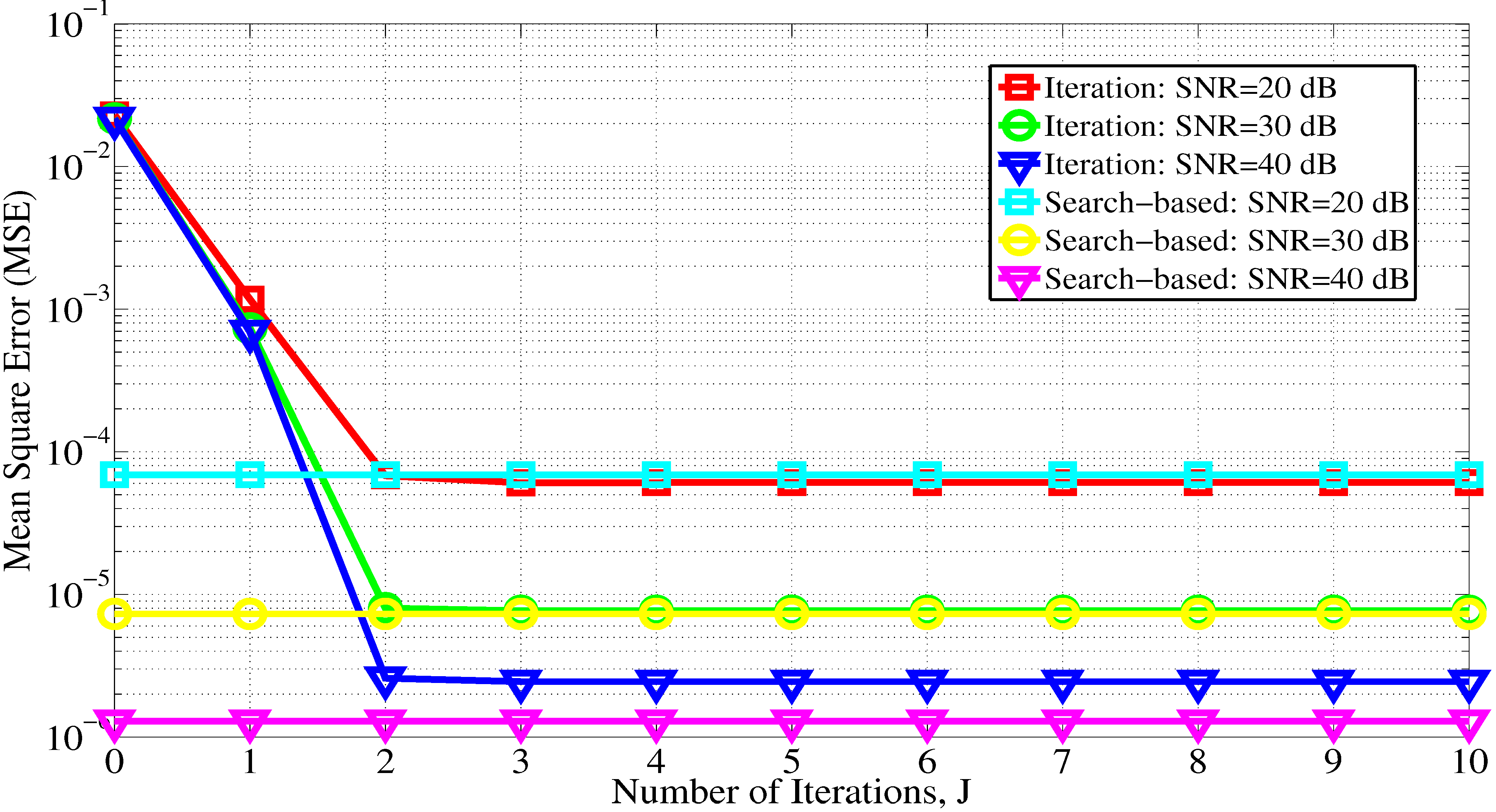 where is the actual CFO, is the estimated CFO obtained through the i-th trial and is the overall number of Monte Carlo trials. To investigate the MSE performance of the proposed iterative CFO estimation, in Figure 1, we demonstrate the convergence characteristic of the proposed iterative CFO estimation while assuming . Although in Section 3, the iterative estimator is shown to cost much less complexity than the search-based scheme, the resultant expense is the reduction of the MSE convergence rate. When compared with the search-based scheme, the iterative method requires two more iterations to achieve the MSE convergence for all considered SNR values. It is noteworthy that at high SNR, say 40 dB, the approximation error in Equation (30) cannot be neglected in relation to the noise effect. This is why the performance of the iterative scheme is somewhat inferior to the search-based estimation in the convergence performance. Figure 2 shows the MSE versus the iteration number for several specific CFO values. The figure indicates that the MSE using the iteration technique converges and approaches that for the search-based approach after three iterations when . The larger the actual CFO is, the more iterations for achieving an estimate close to that of the proposed search-based scheme there will be. In Figure 3, we evaluate the MSE while considering certain RMSs of the channel delay spread. For , it can be seen that the proposed iterative estimator provides distinguished robustness against the variation of the RMS of the delay spread and achieves a performance close to that of the search-based scheme. In addition, the MSE increases as the RMS becomes larger and larger, because a long delay spread will bring about a significant variation in the channel response between subcarriers.