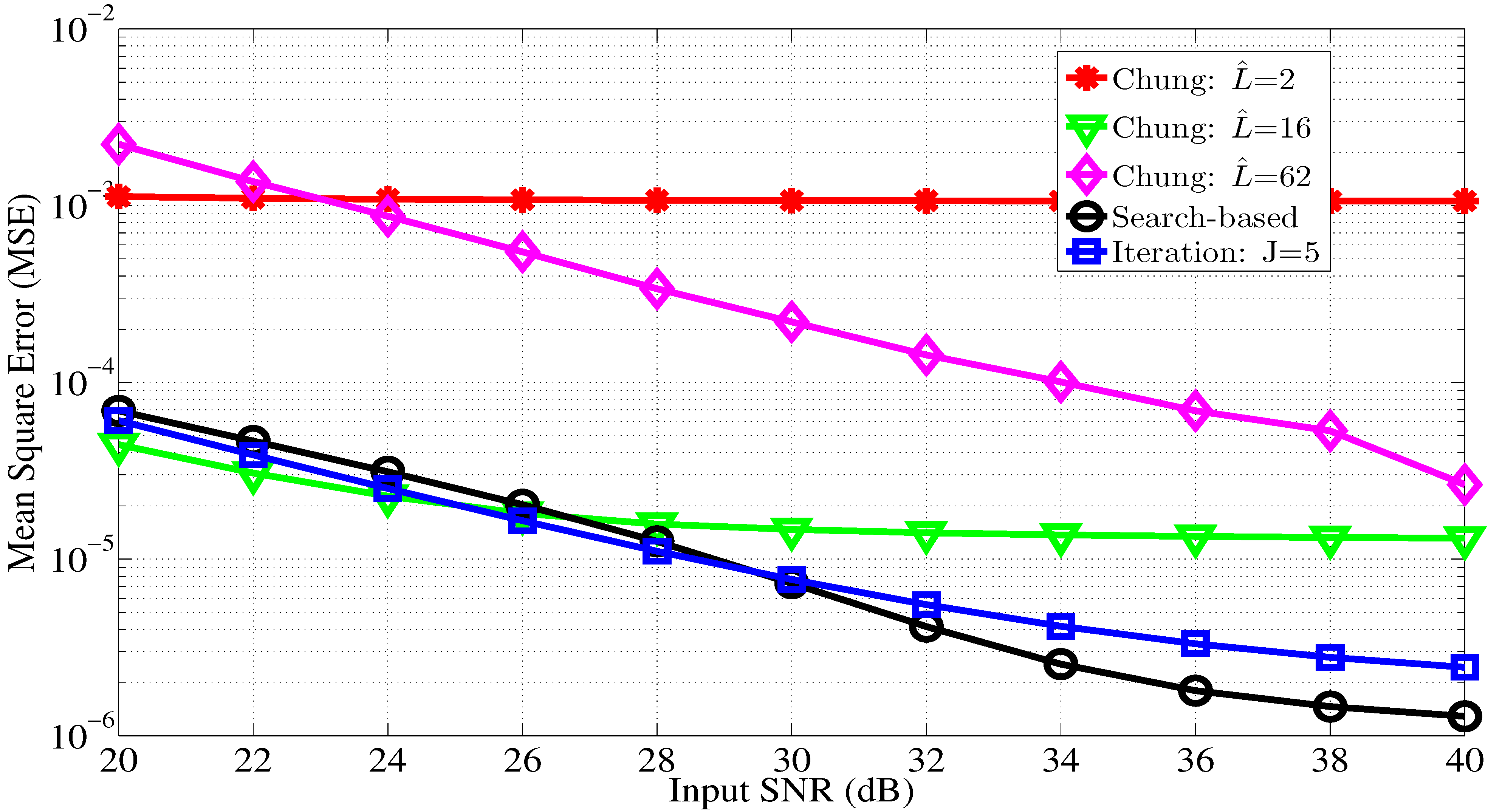 MSE performance of the proposed and Chung’s CFO estimators for different SNRs. N = 256, K = 64, = 0.3, τ = 4 and J = 5.