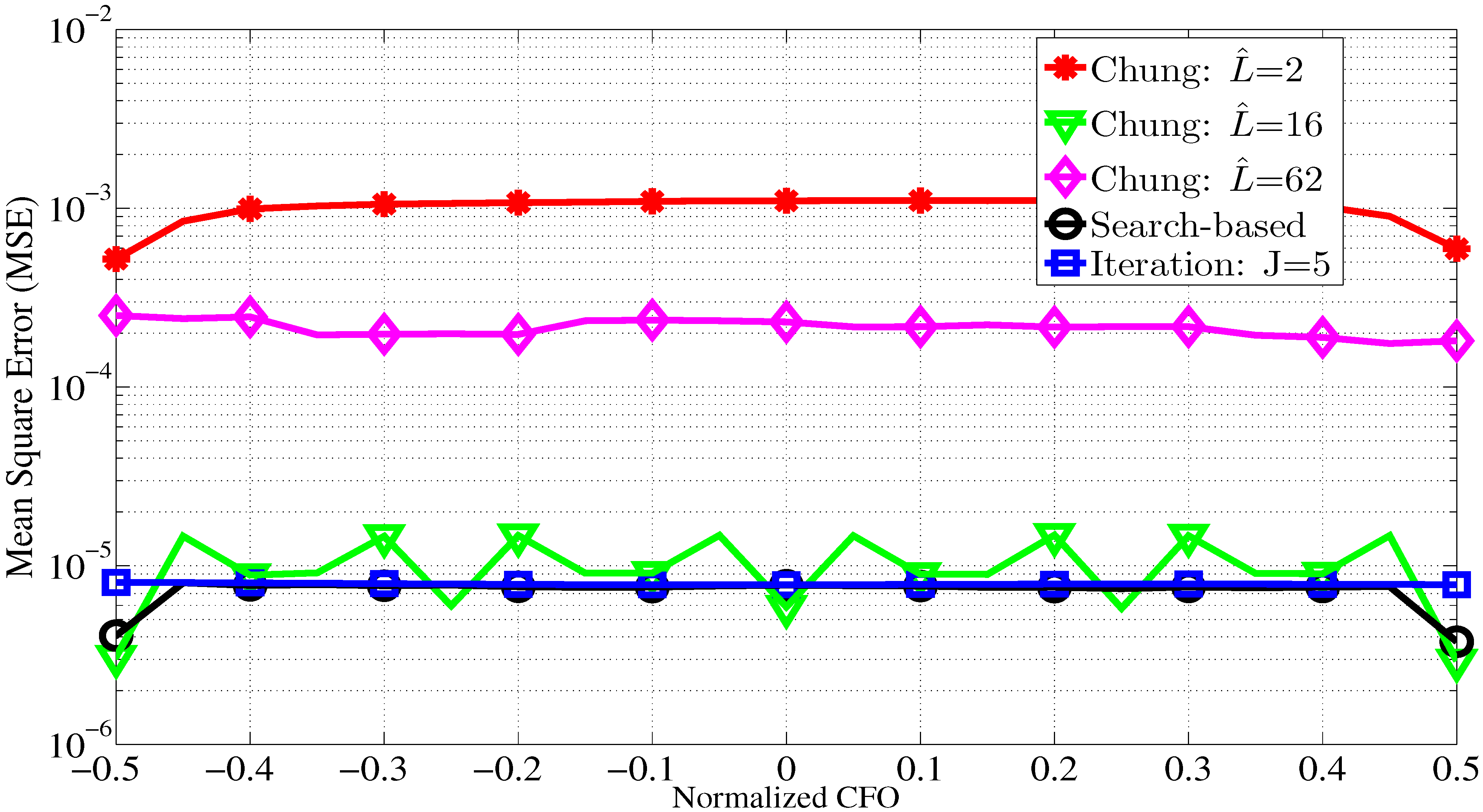 MSE performance of the proposed and Chung’s CFO estimators for different CFOs. N = 256, K = 64, SNR = 30 dB, τ = 4 and J = 5.