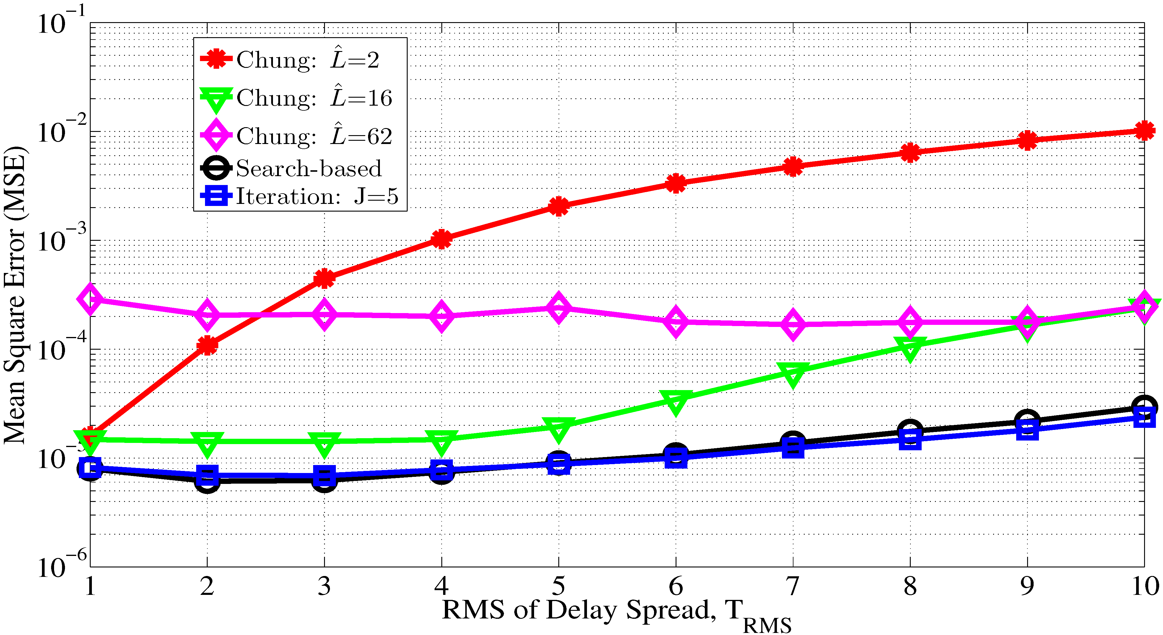 MSE performance of the proposed and Chung’s CFO estimators for different RMSs of channel delay spread, τ. N = 256, K = 64, SNR = 30 dB, = 0.3 and J = 5.