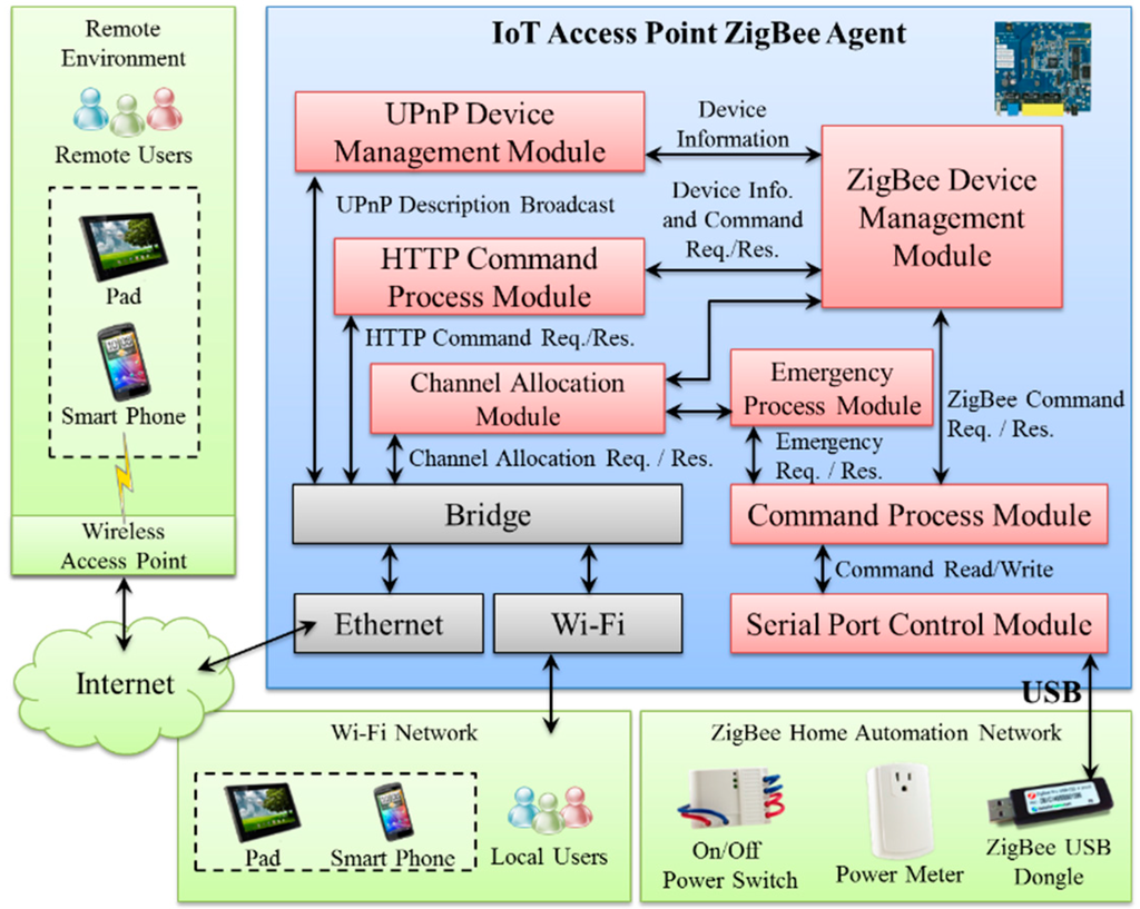 As shown in Figure 2, this paper presents the development of an IoT AP in which we had embedded the ZigBee agent into the existing Wi-Fi AP. Through the developed ZigBee agent, the remote users are able to control the ZigBee devices, which connect to the Internet. In the ZigBee agent, the UPnP Device Management Module is installed in the IoT AP. This module allows the information of ZigBee devices to be broadcasted onto the network and hence these devices can connect with each other wirelessly. In addition, the remote handheld devices are able to discover the ZigBee devices by using UPnP protocol. The ZigBee agent mainly consists of five modules. Consider that a user wants to control some ZigBee devices, which are at home, by sending commands to the IoT AP via Ethernet or Wi-Fi. The Serial Port Control Module provides reading and writing functions to ZigBee USB dongles. Upon the IoT AP receiving the command from a user, the Command Process Module transfers it to the Serial Port Control Module. The Command Process Module uses the functions provided by Serial Port Control Module to exchange and subsequently execute the command from ZigBee transceiver. After that, Device Management Module sends the command to the Command Process Module for grabbing the information of ZigBee devices and transferring it to the UPnP Device Management Module and HTTP Command Process Module. If the user command were sent by using HTTP, the HTTP Command Process Module executes the command first and returns the results to grab the ZigBee devices information. As shown in Figure 2, the Channel Allocation Module implements the negotiation function of the channel usage between Wi-Fi and ZigBee networks. In addition, the Emergency Process Module changes the ZigBee network from power saving mode to the emergency mode, increasing the opportunities of sensors to report their data readings.