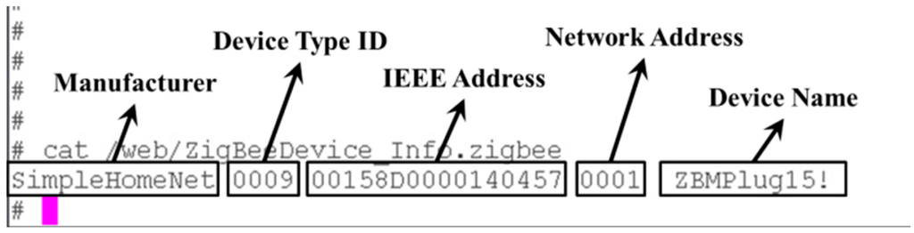 Management Information of ZigBee Device. The pink mark is the command input mark in the CLI (command line interface) mode of Linux.