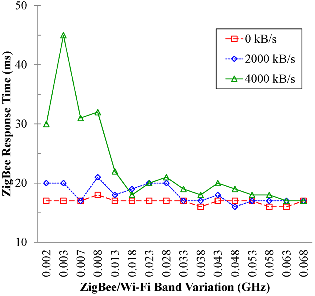 Figure 12 depicts the band variation between various Wi-Fi throughputs (0 KBps, 2000 KBps, and 4000 KBps) and ZigBee response time. The Wi-Fi channel is fixed to CH1 (2.412 GHz) and the ZigBee channel used for testing is changed. The horizontal axis represents the band variation between ZigBee and Wi-Fi (0.002–0.068 GHz) whereas the vertical axis represents the ZigBee response time. As shown in Figure 12, when the Wi-Fi throughputs are 0 KBps and 2000 KBps, the band variation between ZigBee and Wi-Fi has minimal impact against the ZigBee response time, which is 21 ms. When the Wi-Fi throughput is 4000 KBps, the bands used by ZigBee are closer to the Wi-Fi band, which results in longer response time. Upon the increasing amount of Wi-Fi packets, the probability and number of ZigBee packet collision will be higher. Therefore, some ZigBee packets need to be re-sent, which increases the ZigBee response time. However, the commands can be successfully sent to the ZigBee devices and the average of the response time is still less than 45 ms.