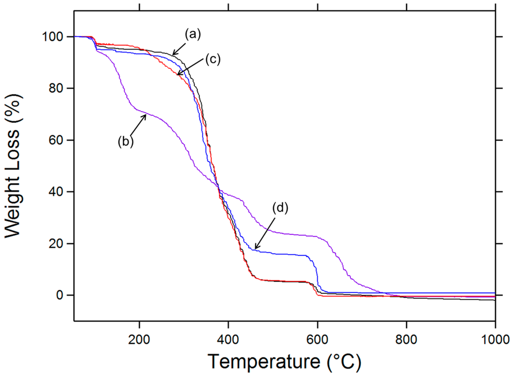 | Sample | TWeight loss (10%) (°C) * | Tpeak I (°C) | Tpeak II (°C) | Tpeak III (°C) |