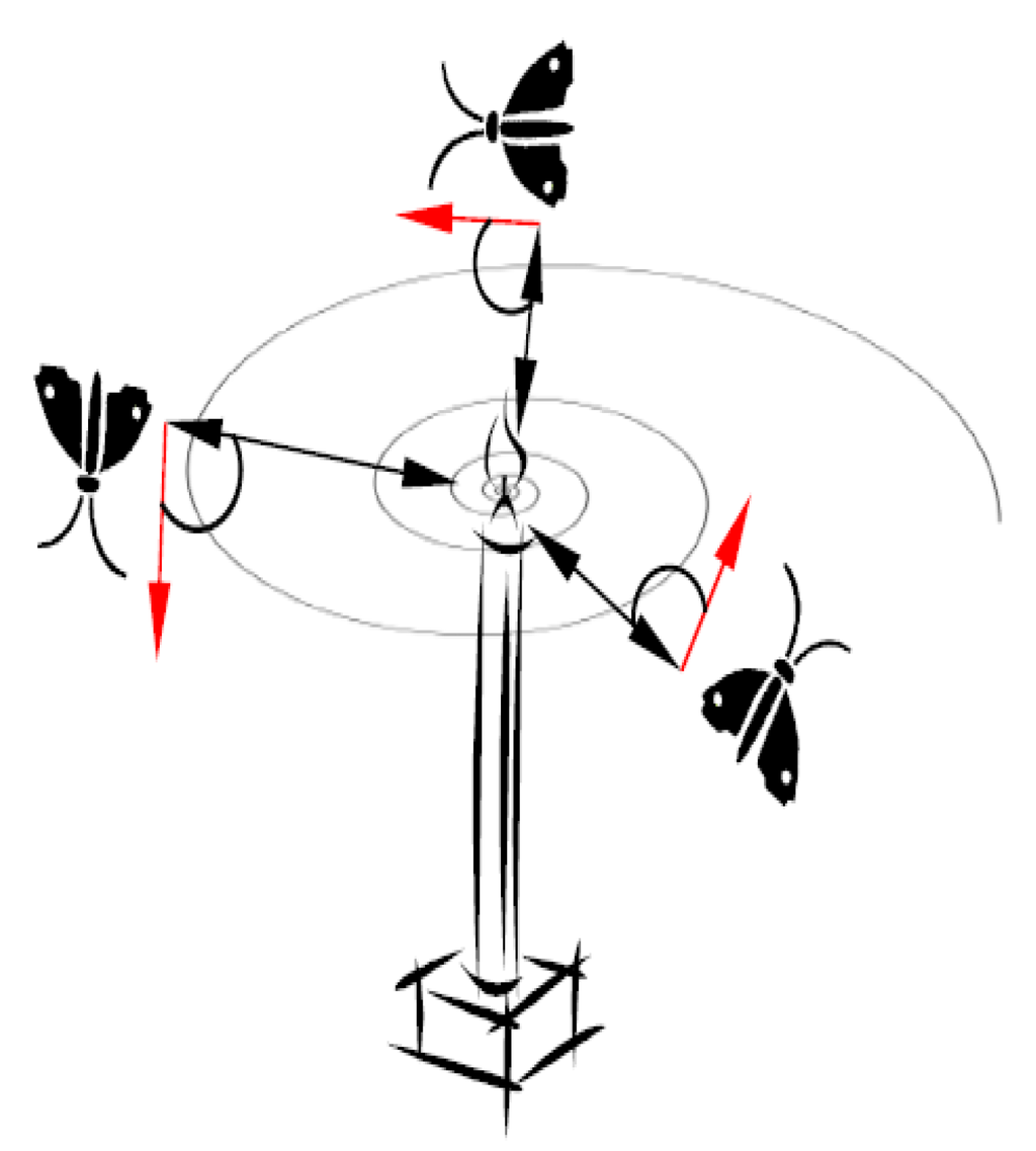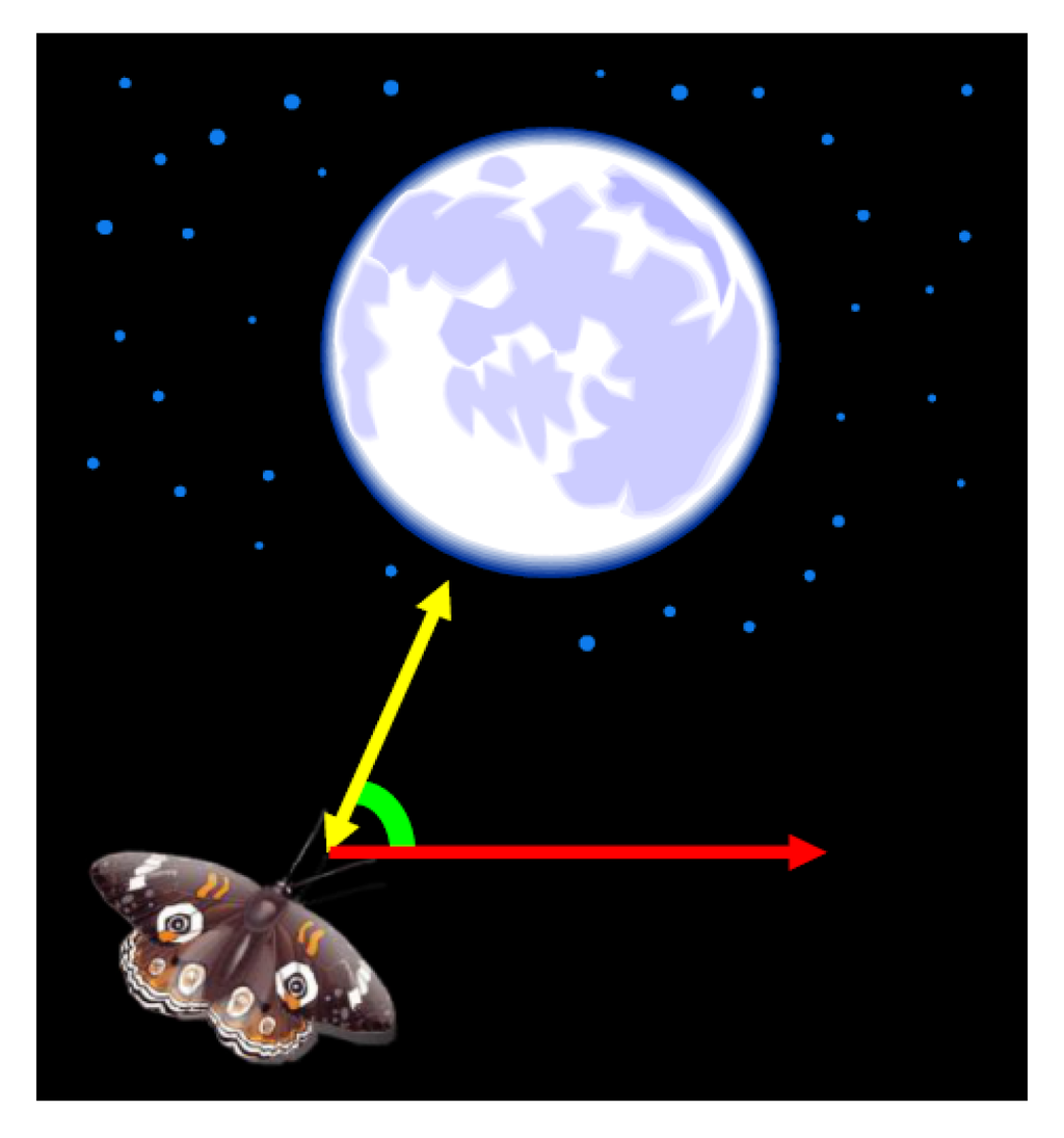 Inspired by the navigation method of moths in nature called transverse orientation, Mirjalili proposed a new intelligent optimization method named Moth-flame optimization algorithm (MFO) in 2015. In this method, a moth flies by maintaining a fixed angle with respect to the moon, which is a highly effective mechanism for travelling long distance in a straight path. A conceptual model of transverse orientation is shown in Figure 1. As the moon keeps a long distance from the moth, this mechanism guarantees flying in straight line. Despite the effectiveness of transverse orientation, what we usually observe is that moths fly spirally around artificial lights, which is due to the inefficiency of the transverse orientation, in which it can only help for moving in straight line when the light source is very far. When moths see an artificial light, they also try to keep a similar angle with the light to fly in straight line. Since such a light is extremely close compared to the moon, maintaining a similar angle to the light source will cause the moth to eventually converge towards the light, which can be illustrated in Figure 2 [54].