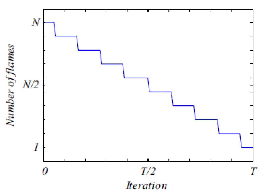 where l implies the current number of iteration, N indicates the maximum number of flames, and T is the maximum number of iterations.