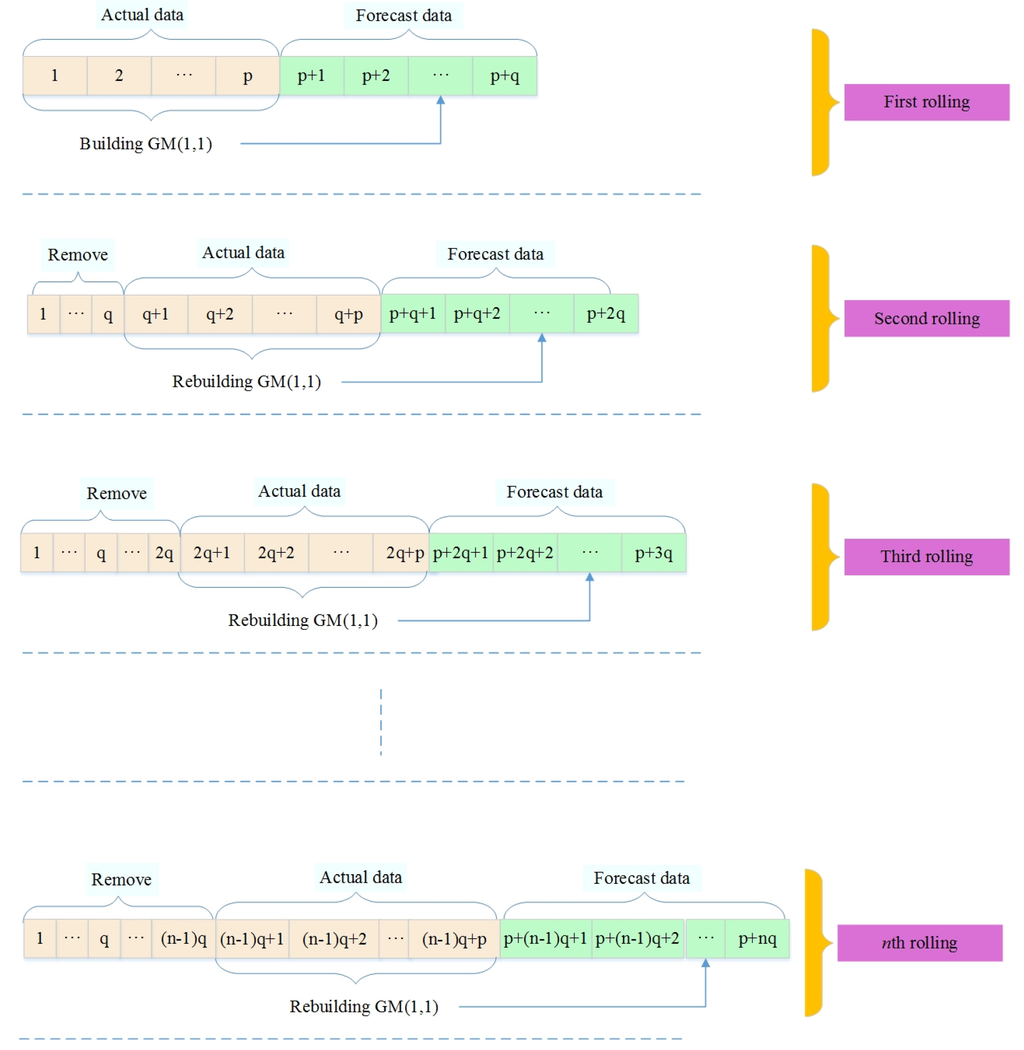 - As the rolling mechanism focused on updating data with the most recent ones, GM (1,1) needs to be rebuilt with p new actual data elements. In order to forecast the data elements , the sequence need to be replaced by the latest p data elements , which would be employed to rebuild GM (1,1).