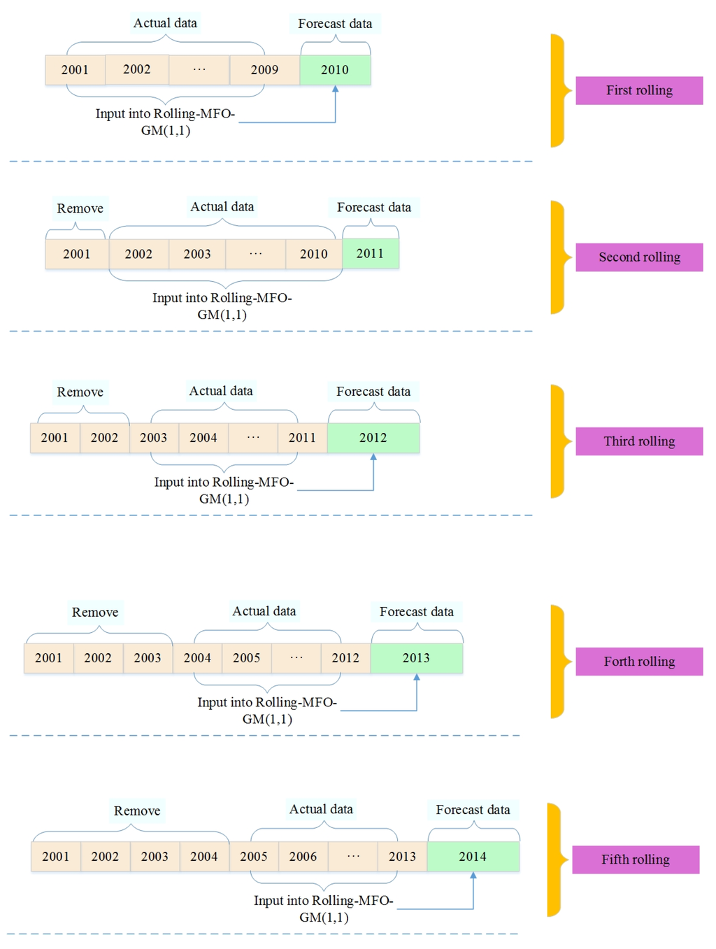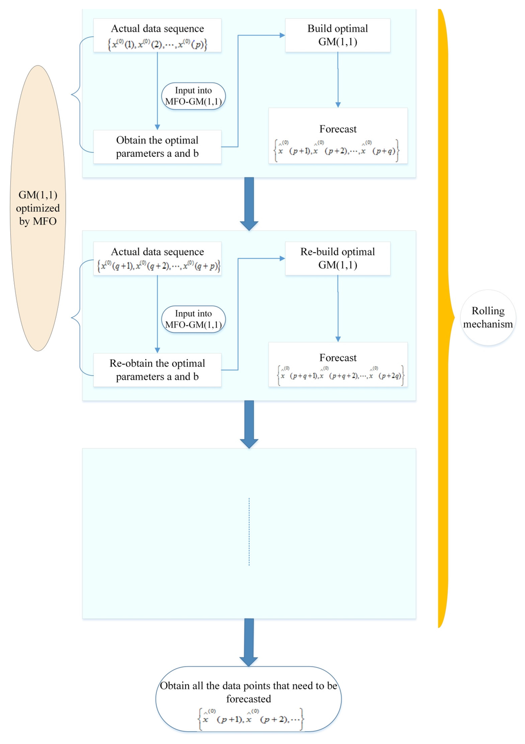 - As the rolling mechanism aims at employing the latest data for forecasting; in this step, MFO-GM (1,1) should be rebuilt using the new practical data sequence . Then, the parameters a and b would be re-optimized by MFO using Equation (23) and the forecasting sequence can be calculated using Equation (13).