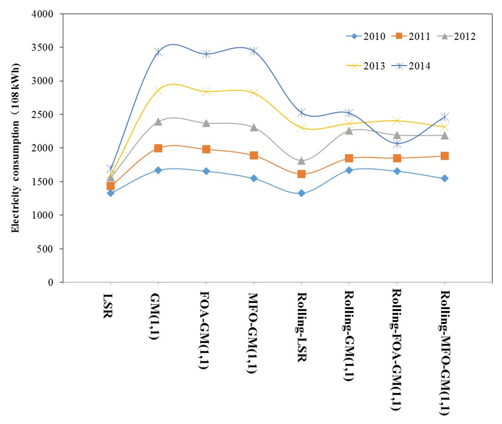 | Year | LSR | GM (1,1) | FOA-GM (1,1) | MFO-GM (1,1) | Rolling-LSR | Rolling-GM (1,1) | Rolling-FOA-GM (1,1) | Rolling-MFO-GM (1,1) |