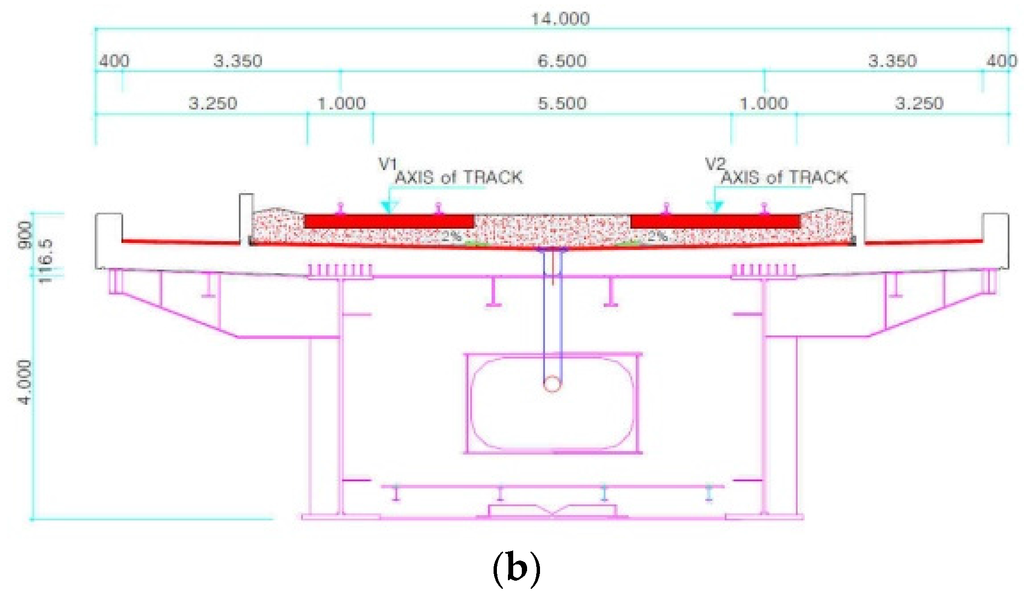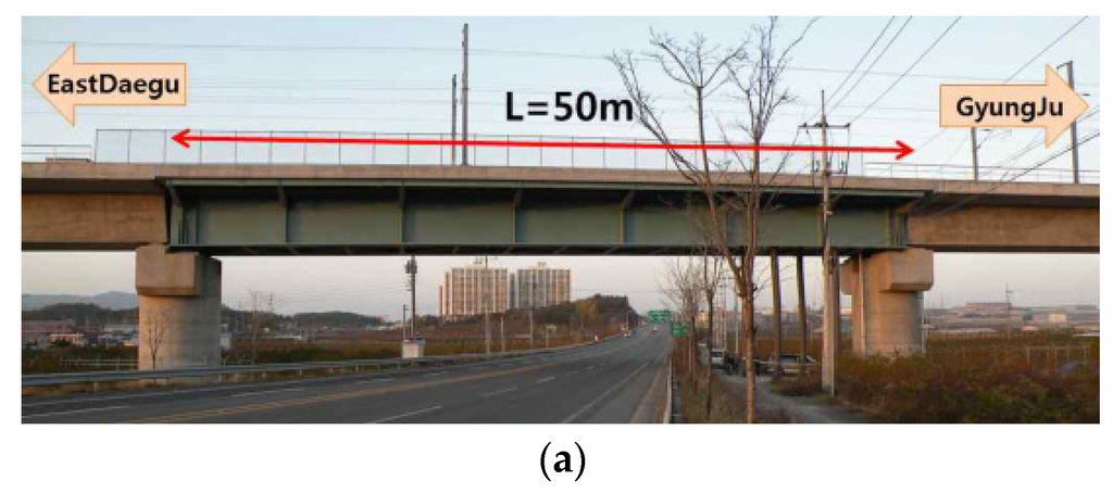 - Lee, J.; Kim, S.; Kwark, J.; Lee, P.; Yoon, T. Dynamic characteristics of high-speed railway steel bridges. Trans. Korean Soc. Noise Vib. Eng. 2007, 17, 632–637. (In Korean) [Google Scholar]