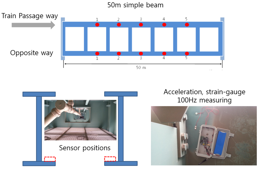 To monitor the behavior of the bridge as per the passing of the high speed trains, a wireless SHM system was designed and installed on the Kaya Bridge shortly after it was opened to use the HEMU-430X train, as shown in Figure 3. This on-line concise SHM system was designed with a minimum of 20 sensors to monitor the key parameters. Moreover, a total of 20 accelerometer and strain gauge sensors (five sensors on each railway track) with sampling frequency of 100 Hz were installed on the main girders under each railway track in each direction with equal-spacing of 8.3 m. The sensors were installed at the bottom flange of the main girders in the vertical direction to detect and monitor the vertical vibration and fatigue of the bridge, as illustrated in Figure 3. The entire system consists of a set of sensors, data acquisition, data transmission, data management and a structural evaluation mechanism. The primary purpose of the system is to monitor in-service performance of the bridge structure under high-speed trains, and to provide early warning of abnormal changes in in-service performance of the bridge. Herein, the structural parameters to be monitored in the Kaya Bridge were determined using the structural sensitivity analysis with the finite element model under the designed train speeds action, as shown in Kim et al. [5]. Other important parameters including accelerations, strains, deformations and fatigue of the steel box girder bridge were monitored and studied under different speeds of the passing high-speed trains.