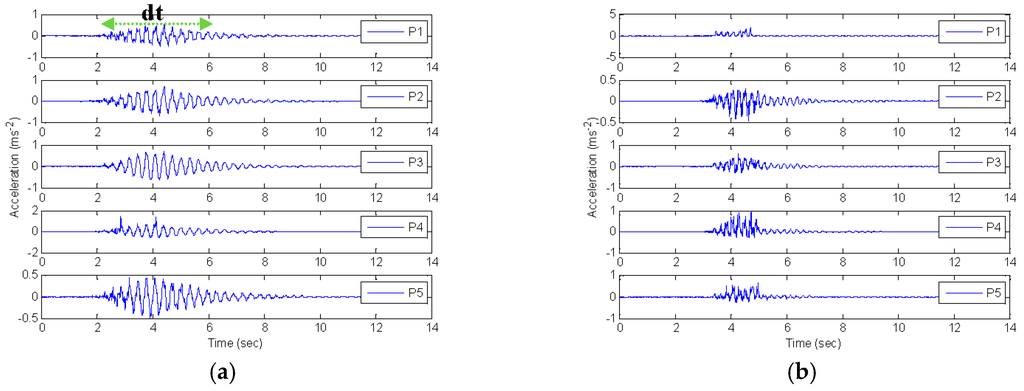 Figure 4a,b illustrate the typical vertical acceleration time histories of the passage monitoring points of the girder measured from accelerometers 1 to 5 for the 290 km/h and 406 km/h speed, respectively. It can be seen that the dt, (dt = t2 (leave time) − t1 (entrance time)) values are reported as 5.9, 2.92, 1.9 and 1.85 s with the speeds 290, 360, 400 and 406 km/h, respectively. This means that the vibration time effect on the bridge decreased by 68.65% as the train speed increased from 290 to 406 km/h. In addition, it is observed that the vibrations of the monitored points at a speed of 290 km/h are approximately the same, while as the speed increased, the entrance and exit monitoring points are experiencing high vibration response compared to the mid span point.