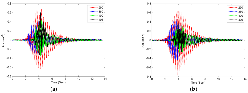 Vertical acceleration time histories of the girder caused by a high-speed train. (a) passage response points for 290 km/h; (b) passage response points for 406 km/h.