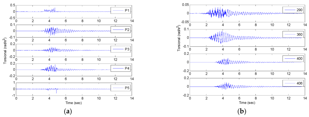 Figure 6 illustrates the dynamic torsional behavior of the bridge girder based on vertical acceleration measurements [21].The torsional behavior of the girder due to train passage at 406 km/h is shown in Figure 6a. While the torsional behavior of the mid span point at different speeds is shown in Figure 6b.